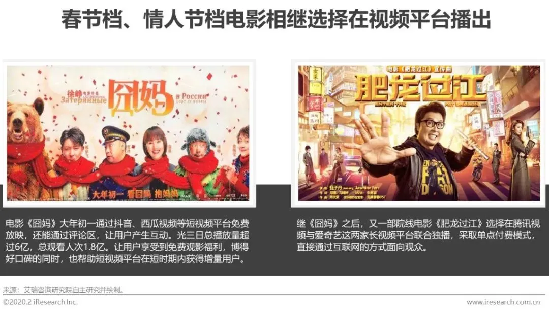 2019年短视频发展火爆,短视频已经成为普通百姓获取网络信息的重要渠道。2020年春节疫情期间,为预防疫情,在提倡宅家抗疫电影院关闭的影响下,贺岁片《囧妈》打破院线首发先例,选择了在短视频平台播出,这对影视行业而言,也成为了一条新的拓展路径。在今年上半年的后疫情期,大部分线下影城仍可能处在停业状态,且网络视频相较院线拥有费用低,可碎片化观看的特点,更多的院线电影选择在视频平台上映将成为新方向,短视频平台也可能拥有在线院线形态这一新的内容消费场景。