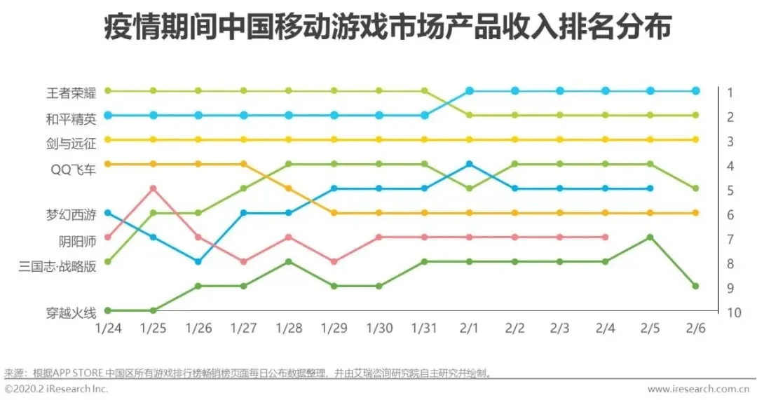 在疫情期间,头部移动游戏的收入排名变化幅度并不显著,整体趋势平稳。在上榜的8款游戏中,有7款游戏都属于重度社交类游戏,可见线上交互的优势在疫情影响下得到了进一步的放大。而唯独一款偏“单人向”的二次元放置类游戏《剑与远征》,是2020年1月新上线的产品,其收入排名仅次于《王者荣耀》与《和平精英》,始终保持在第三名。从2019年开始,二次元放置类手游数量明显增多,且各自侧重点不同,往往能通过自身的差异化与创新点,让产品在上线初期取得不俗的成绩,但能始终保持成绩的产品却并不多。从《剑与远征》在疫情期间的数据表现来看,有望成为下一款长生命周期的二次元头部游戏产品。
