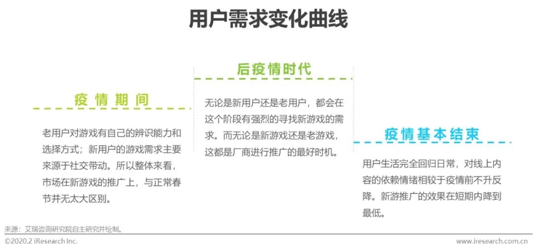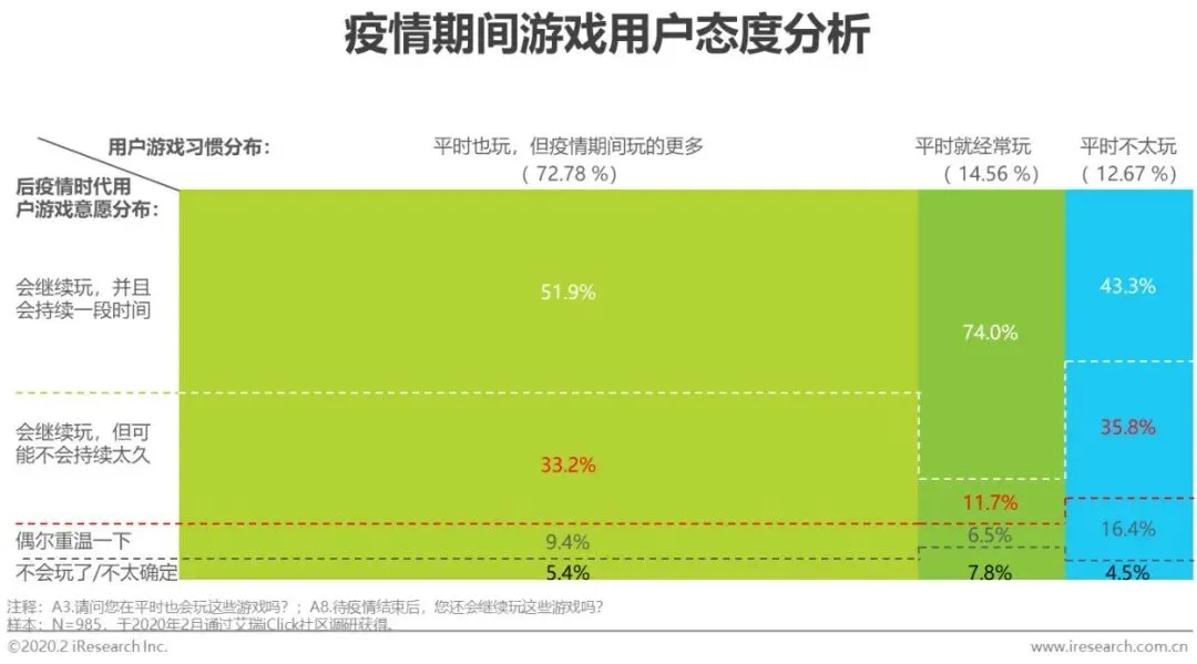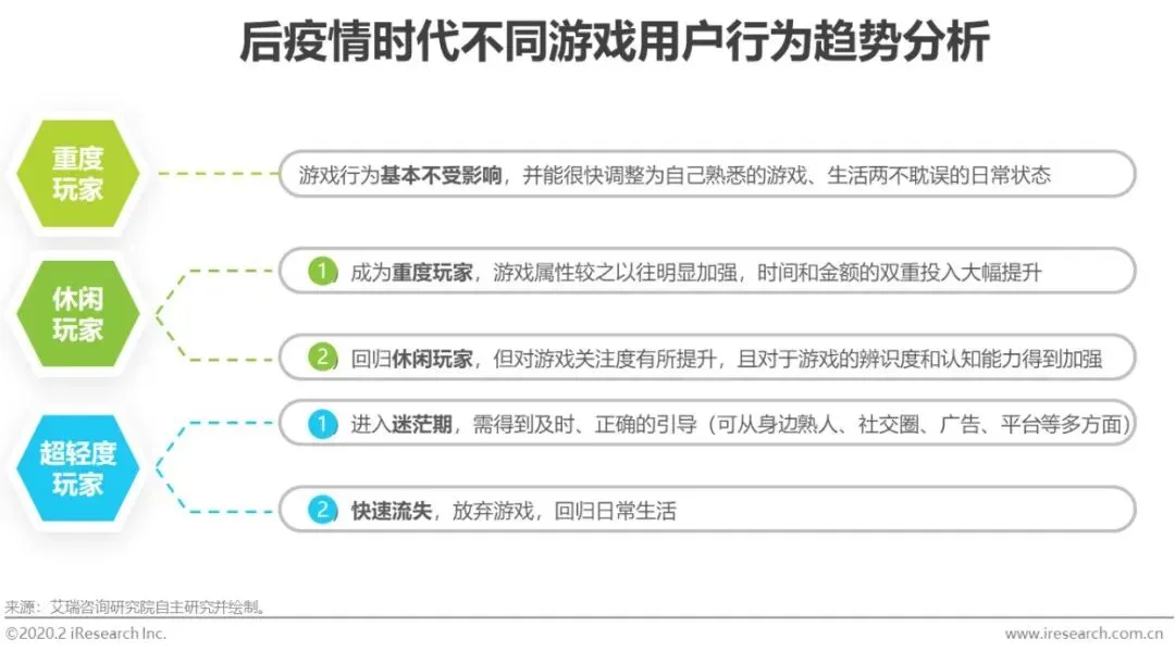 正如前文所述,虽然疫情期间的活跃游戏用户数量有所增长,但这些增长主要来源于“春节”+“疫情”的双重影响,属于被动增长。在这段时间内,用户对于游戏产品的粘性取决于“社交需求”和“时间充裕”两个主要方面。而一旦进入后疫情时代,用户这两方面的游戏因素都大幅降低后,对于疫情期间有过明显增长的游戏产品来说,必然产生用户持续流失的趋势。游戏厂商应当为此早做准备,在后疫情时代的影响消散之前,尽量推出能促进用户持续游戏行为的玩法和活动,特别是对于需要“减压”的用户也提供他们更多的游戏方式,以保证留存率为主要短期目标。当玩家再次习惯日常生活节奏下的游戏体验后,才能真正展现出其核心用户的价值。