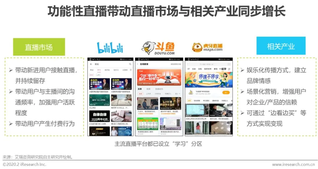 2019年,李佳琦的成功,让“直播带货”成了功能性直播的主要根据地。但进入2020年后,随着疫情的持续蔓延,企业直播会议、学校直播授课都相继开通,甚至到厨师直播做菜、医生直播会诊等功能性直播市场都被同步带动。功能性直播不仅在展现形式上更加贴近受众,而且具备一定的“监管”作用,不会存在后期剪辑等虚假营销的成分,所以用户的接受程度也相对较高。艾瑞分析认为,未来功能性直播将以更加成熟的内容、更加丰富的形式,成为直播市场重要的细分领域之一,并且也将成为企业(特别是线下实体企业)在线上布局的重要战略之一。