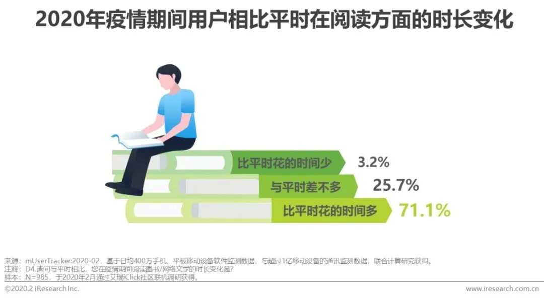 受新型冠状病毒肺炎疫情影响,今年处于疫情期间的春节假期里,移动阅读APP的日均独立设备数1.3亿台,较去年春节期间增幅明显,平均增长了800多万台,艾瑞iClick的用户调研数据也显示,疫情期间超七成用户表示在阅读上花费的时间也比平时多。这一方面是由于移动阅读的用户规模在稳步上升,另一方面疫情期被动宅家也让更多的用户有了静下心来好好阅读的机会。