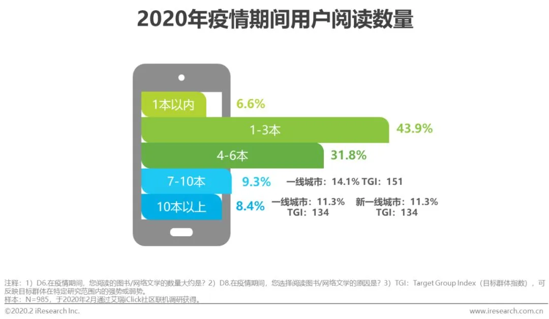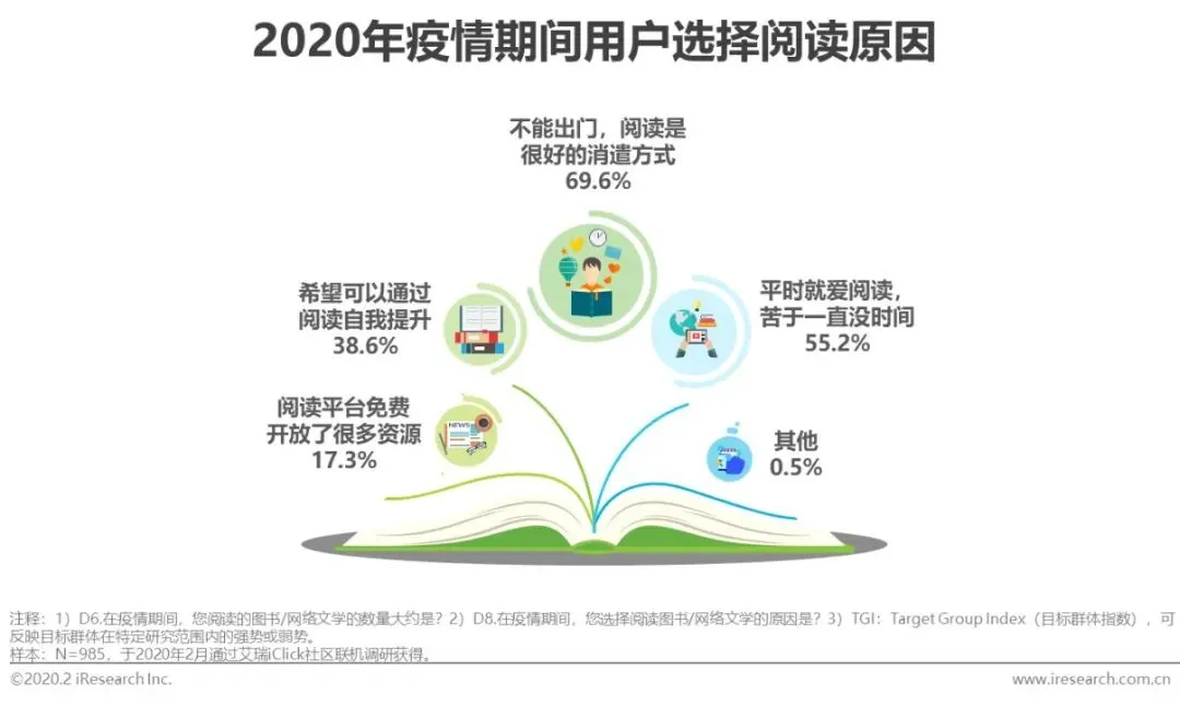 艾瑞iClick用户调研数据显示,在2020年疫情期间,69.6%的用户宅家选择阅读的原因是因为不能出门的时候阅读是一种非常好的消遣方式,另外有超过半数的人表示平时就爱阅读,苦于一直缺少时间。在疫情期间的用户阅读量方面,一线城市及新一线城市的用户阅读意愿相较二三线城市更强,阅读7本及以上的倾向性更高。