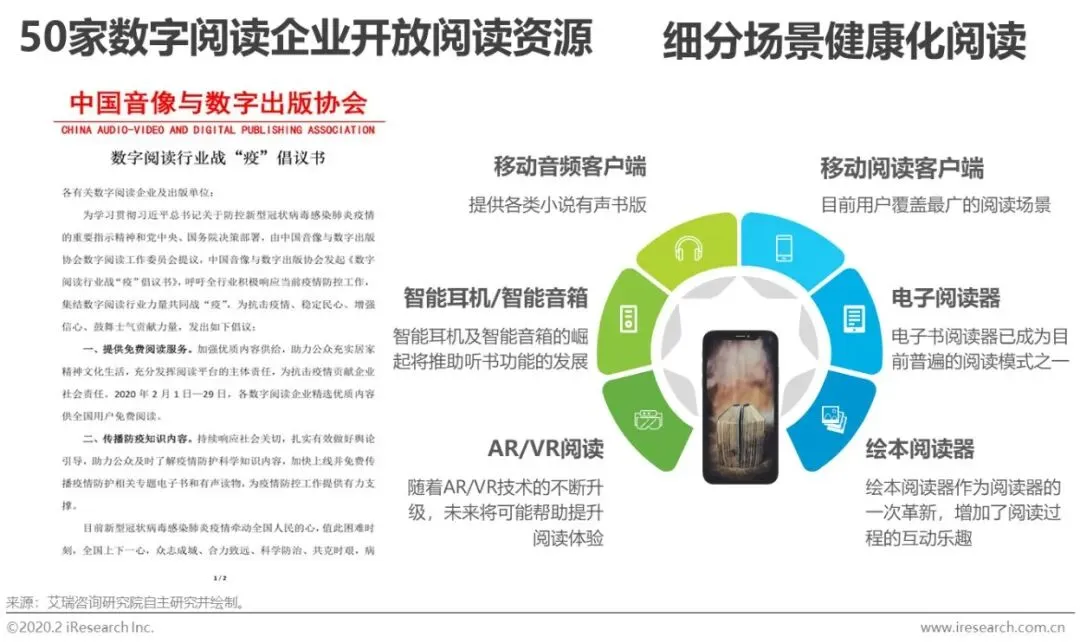 在疫情发生后,中国音像与数字出版协会也联合阅读行业的一些头部企业如阅文集团、咪咕等50家联合发起《数字阅读行业战“疫”倡议书》,通过对大众免费开放旗下优质资源,吸引了更多新用户的同时将更多的优质内容传递给大众,而15~30天的周期,也足以帮助这些新用户认识到阅读的重要性,并形成一定程度的阅读习惯。此外,随着5G新时代的来临及用户对健康及高品质视听享受的诉求愈发强烈,阅读场景也将从电脑、手机端移至不伤眼的墨水屏阅读器、绘本阅读器、智能音箱等,满足用户多场景下的沉浸式阅读体验的需求。