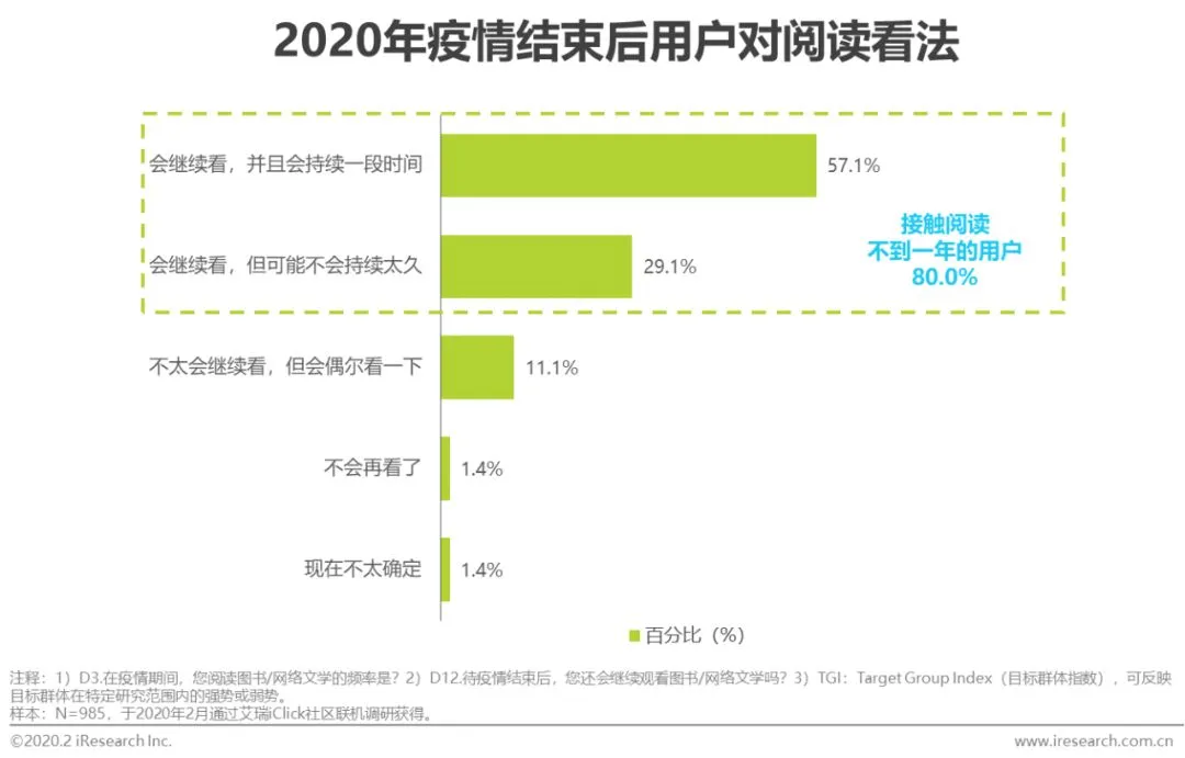 在2020年疫情期间,超过半数的用户每天都会阅读小说,其中84.2%接触阅读/网络小说超过五年的用户有每日阅读的习惯,另有30.8%接触阅读一年以下的用户也在疫情期间养成了每日阅读的习惯。而在疫情结束后,86.2%的用户表达了会继续阅读的想法,在接触阅读不到一年的用户中也有近8成用户表示疫情结束后会持续阅读。因此,在精品化内容作为小说的核心竞争力的前提下,后疫情期阅读企业也应该加大培育优质内容,通过自身优质内容及运营将因疫情新增的用户转化为老用户,做好用户留存,才能更有助于长期稳定的增长变现。