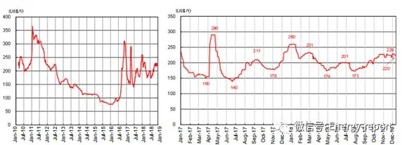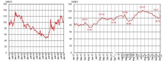 动力煤现货价格(离岸价格)在70~120美元/吨之间波动,主要原因是中国方面的因素,即2016年早些时候中国结束了自2011年以来煤炭价格的持续下行趋势。2018年,在下滑至100美元/吨之前,动力煤价格在夏季需求季采购时上涨至120美元/吨。目前,动力煤价格超过100美元/吨。