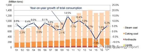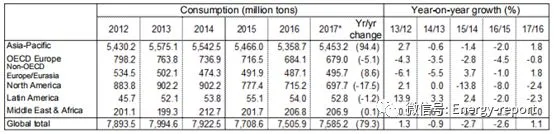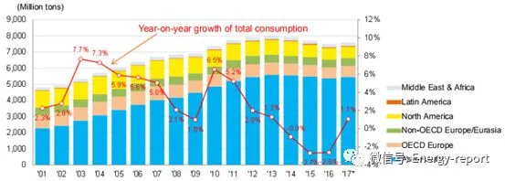全球煤炭消费趋势:增长主要在亚洲,全球煤炭消费在2013年达峰,2014~2016年出现回落,2017年再次出现显著增长。