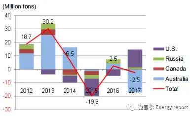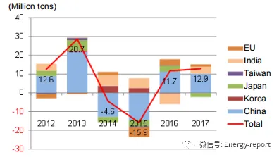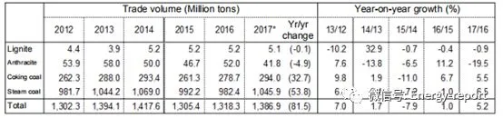 全球煤炭贸易:在2015年超过1亿吨的下降之前,全球动力煤和炼焦煤贸易由于需求的增长而不断增加。然而,煤炭贸易在2016年和2017年再次增加。