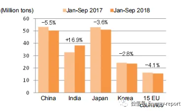 主要国家的炼焦煤进口情况: 炼焦煤进口主要在中国和印度增加。中国在2014年和2015年减少了炼焦煤进口,2016年和2017年开始增加,给炼焦煤市场带来重大的影响;在2018年前三季度,印度进口煤同比去年增加了16.9%,而其他主要的进口煤国家均同比减少。