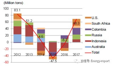 不同国家动力煤进口同比变化情况(2012~2017年)