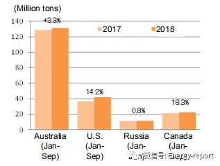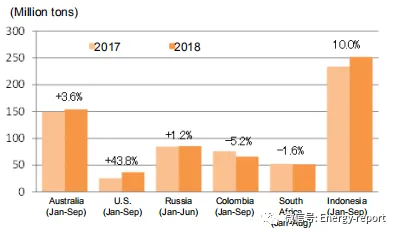 主要国家的动力煤出口情况:澳大利亚和印度尼西亚一直在扩大动力煤出口量。从2014年开始,由于中国和印度方面出口量的锐减,印度尼西亚的出口量开始减少。在2018年前三季度,印度尼西亚、澳大利亚、美国和俄罗斯扩大了出口量,尤其是印度尼西亚的出口有显著的增长。相反的,哥伦比亚和南非在2017年大幅扩大出口后减少了出口。