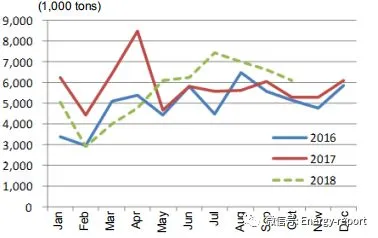 印度煤炭进口情况:2018年前3个季度,印度煤炭进口(不包括褐煤)总量为1.663亿吨,同比增长了16.7%,动力煤和炼焦煤进口几乎每个月都同比增加。印度动力煤进口增加是由于国内煤炭质量和成本问题,以及新煤电的投运。炼焦煤进口的增加则是由于国内资源不足。