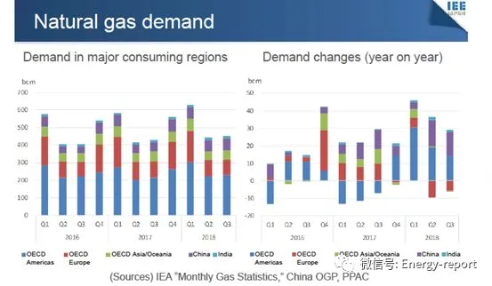 在OECD的国家当中,天然气在2018年前三季度的需求量,中国和印度从96bcm增长了6.7%,达到了1527bcm。