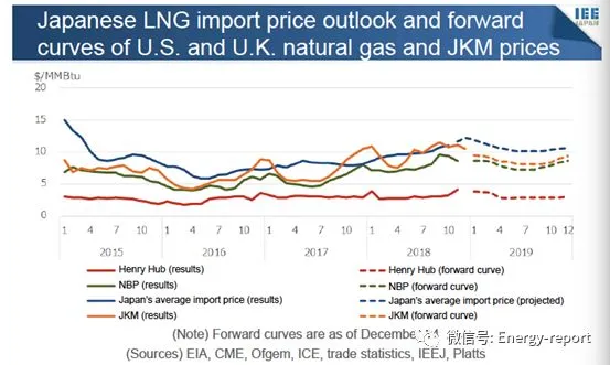2019年日本对于LNG的进口价格预计为平均$10.2~11.4/MMBtu($9.4~10.9/MMBtu 在较低油价的情况下)。