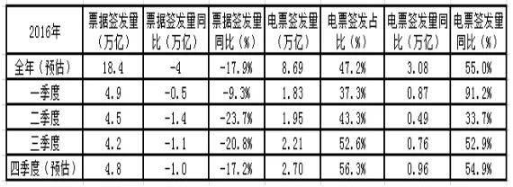 2016年电票签发继续增长,接近与纸票平分市场;展望2017年,电票签发占比继续提升,我们预计达到70%以上;