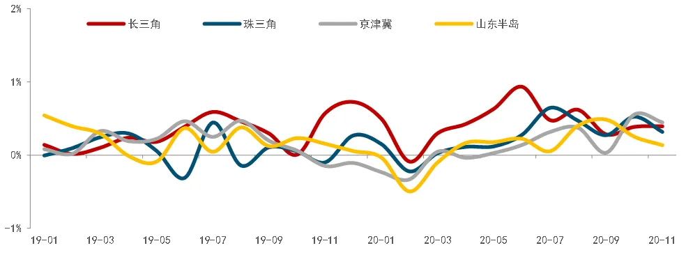 图:2019年至2020年11月重点城市群新建住宅均价环比涨幅