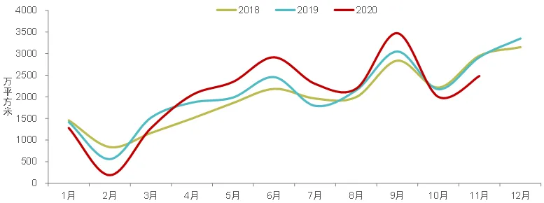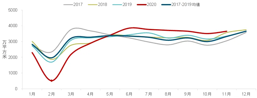 图:2017-2020年11月50个代表城市商品住宅月度成交面积走势