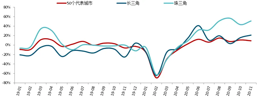 疫情后长三角市场率先恢复,珠三角后期发力,市场规模持续领先增长。2020年1-11月重点城市商品住宅成交面积降幅收窄,其中长三角及珠三角地区代表城市整体规模同比分别增长5.5%、20.7%,是支撑50城市场规模的主要力量。其中长三角地区受益于疫情后供需两端支持性政策落地更早,3月起市场规模恢复幅度即较为突出,直至6月,同比增幅均明显领先于50城及珠三角地区;下半年,受区域内热点城市调控持续收紧影响,加之压制需求高位释放后支撑度减弱,长三角同比领先优势不再突出。而珠三角地区核心城市调控虽也有收紧,但深圳城市规划定位高,新房资源稀缺,供应大幅放量带动需求积极入市,加之随着深圳、东莞调控收紧,广州区域人才政策的放松吸引置业需求积极流入,下半年以来珠三角地区代表城市商品住宅成交规模同比增幅持续领先于50城整体及长三角30个百分点左右,短期市场活跃度较高。