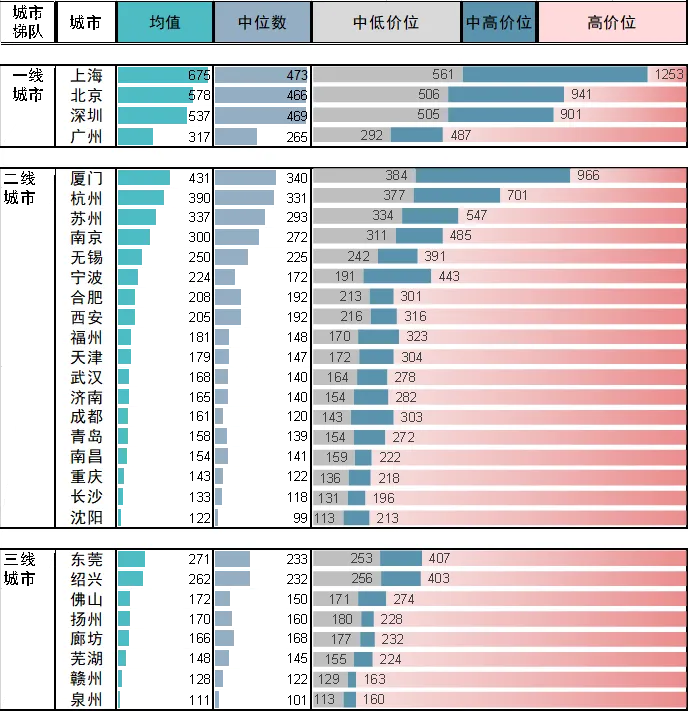 基于套总价、结合成交量,我们将30个城市不同层次的楼盘分为三类:中低价位、中高价位、高价位,具体划分方式为:首先根据套总价对所有新房楼盘进行降序排列,成交量占前10%的属于高价位楼盘,10%-40%属于中高价位楼盘,后60%属于中低价位楼盘。