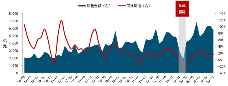 图:2016年至2020年11月代表房企月度销售额及同比增速