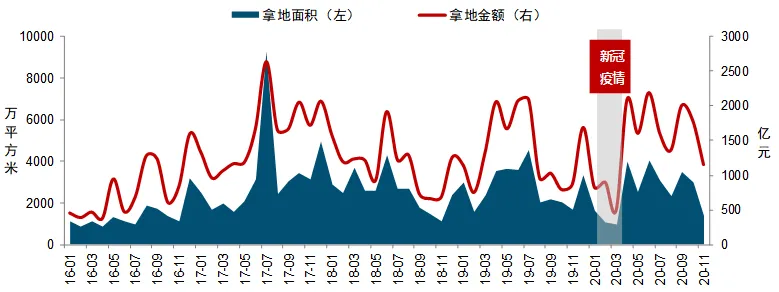 图:2016年至2020年11月代表企业拿地面积和金额情况