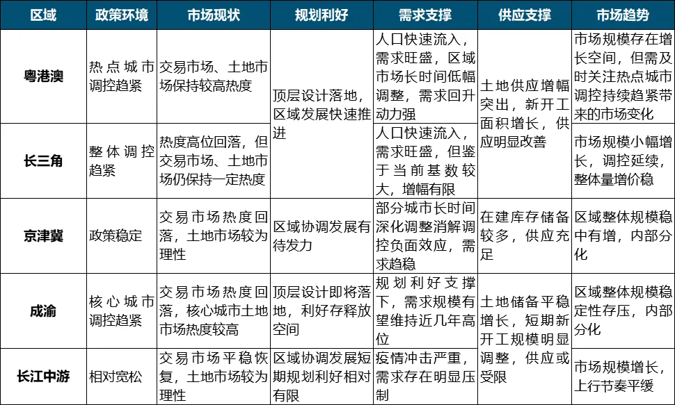 综合对五大城市群房地产市场现状、调控政策、发展规划前景与供需两端支撑所做的分析,及对2021年宏观环境的预判,我们对2021年五大城市群市场趋势做出如下判断。