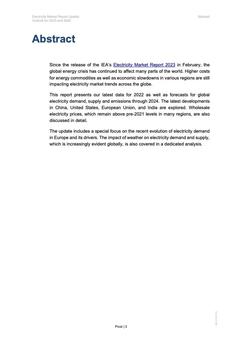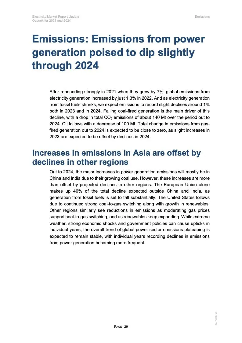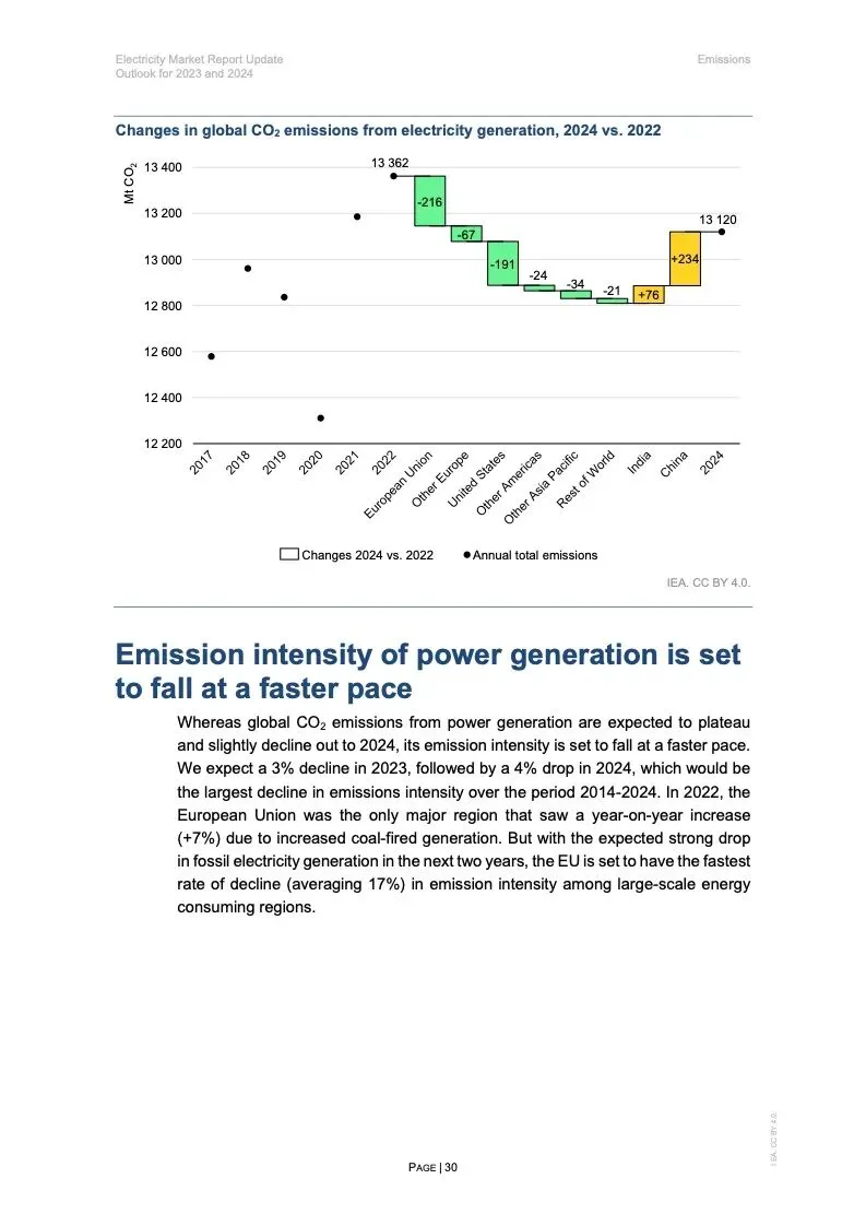 本报告提供了有关全球电力需求、供应和排放的2022年最新数据,以及对截至2024年的分析预测。报告对中国、美国、欧盟和印度的电力需求变化情况及其驱动因素进行了分析,并指出,随着越来越多的可再生能源应用于发电,全球发电碳排放量将略有下降。