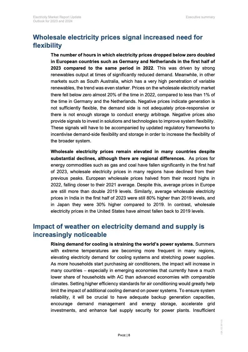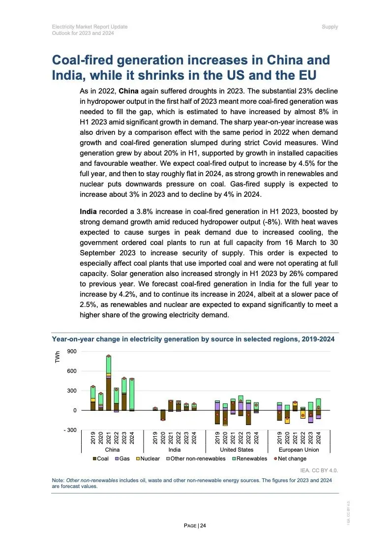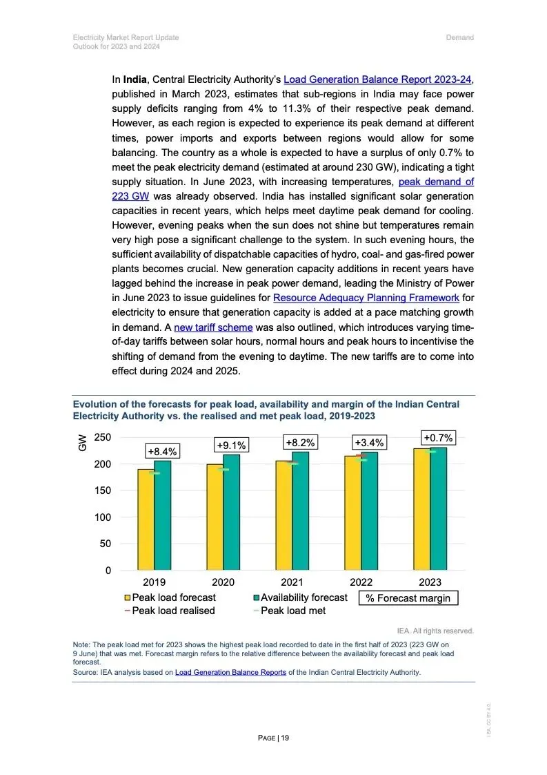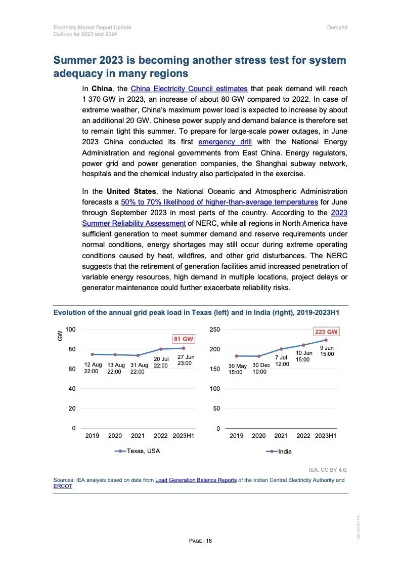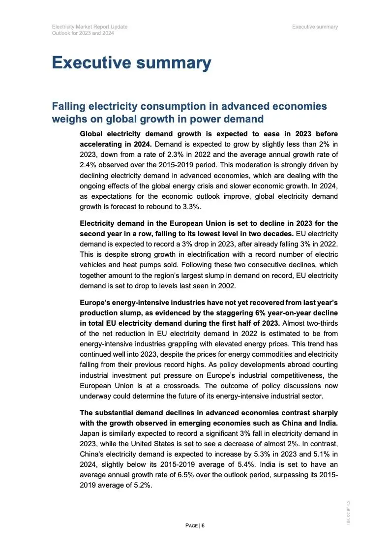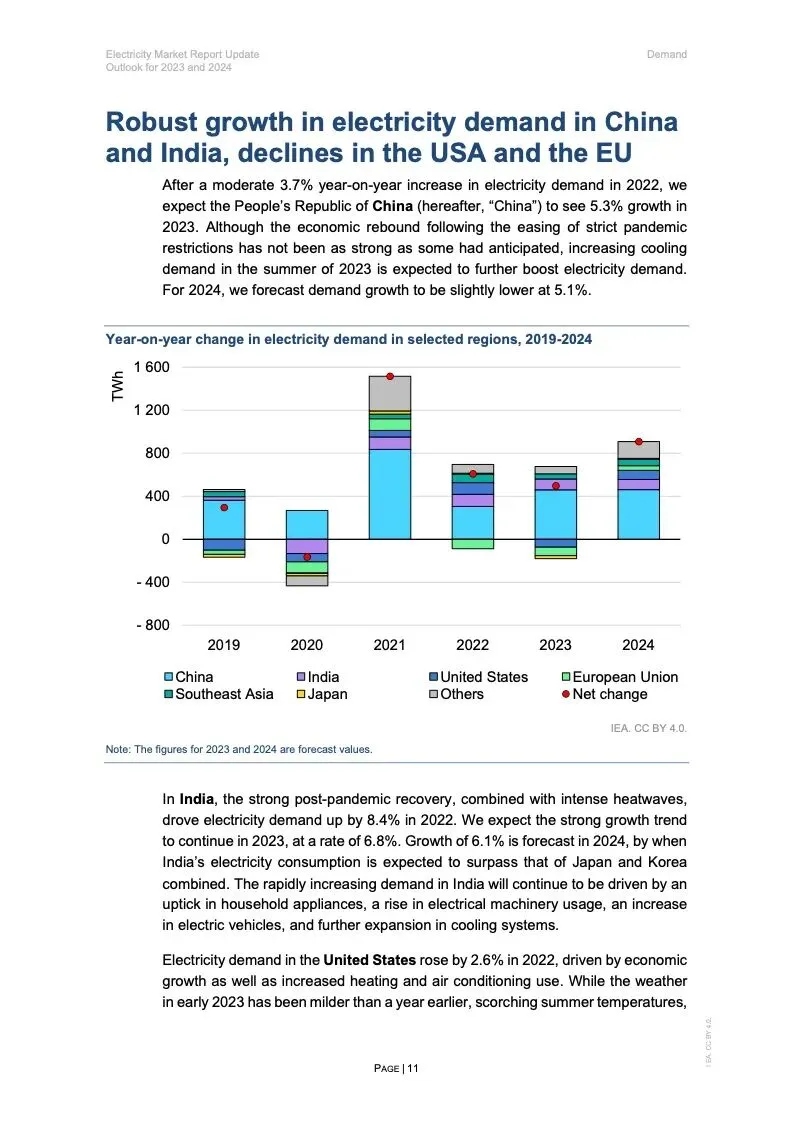 中国和印度等新兴经济体的电力需求增长与发达经济体的需求下降形成鲜明对比。2023年,中国的电力需求预计将增长5.3%,2024年将增长5.1%。2023年,印度电力需求的年均增长率预计将达到6.8%,2024年预计为6.1%,届时印度的电力需求将超过日本和韩国电力需求的总和。
