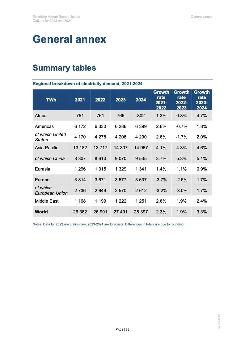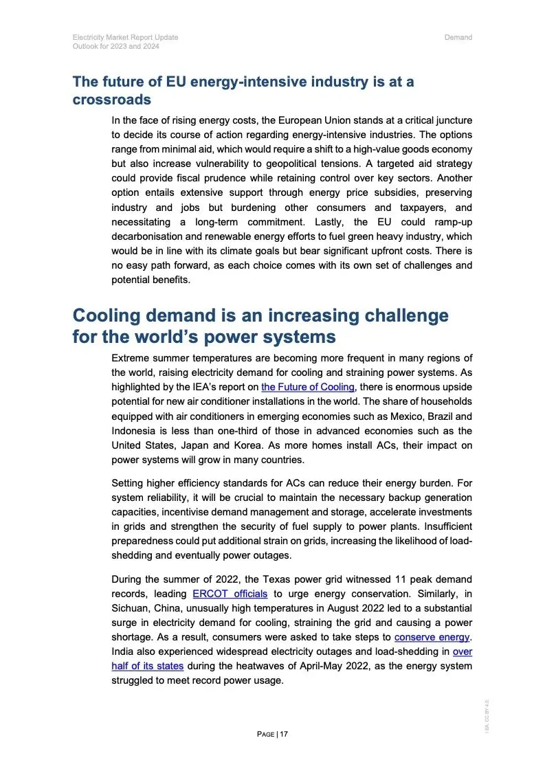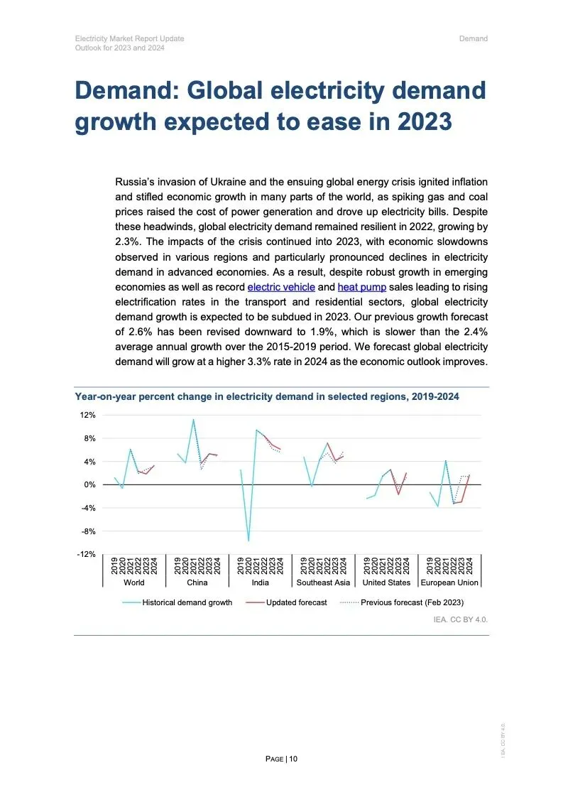 全球电力需求增长预计将在2023年放缓,然后在2024年加速。预计2023年的需求增长率为1.9%,低于2022年的2.3%和2015-2019年期间2.4%的平均年增长率。不过到2024年,随着全球对经济前景预期的改善,全球电力需求增长预计将反弹至3.3%。