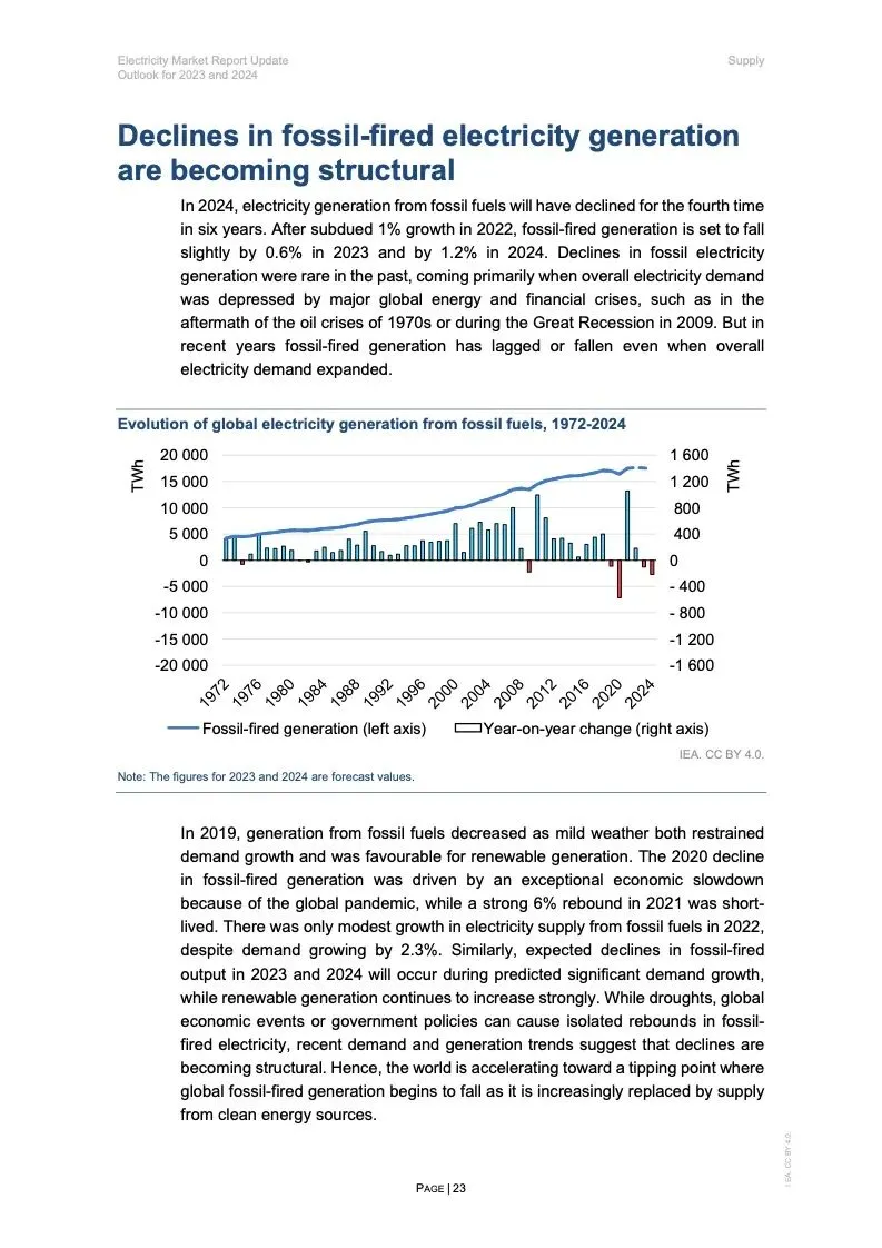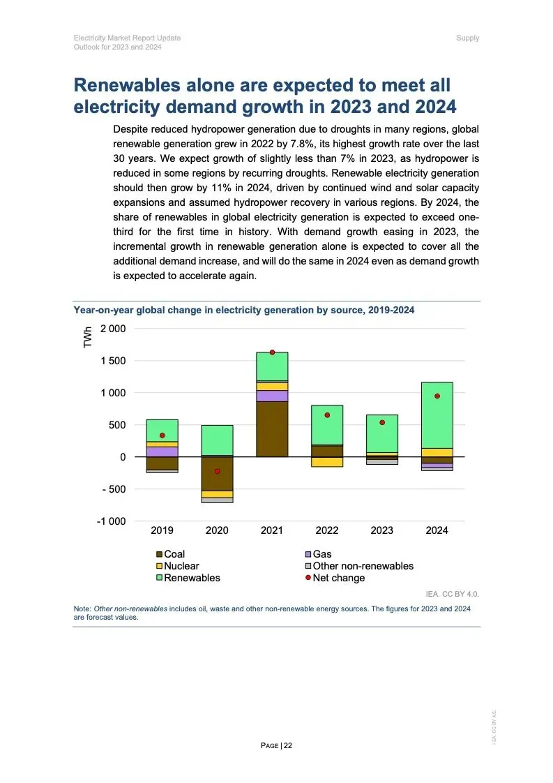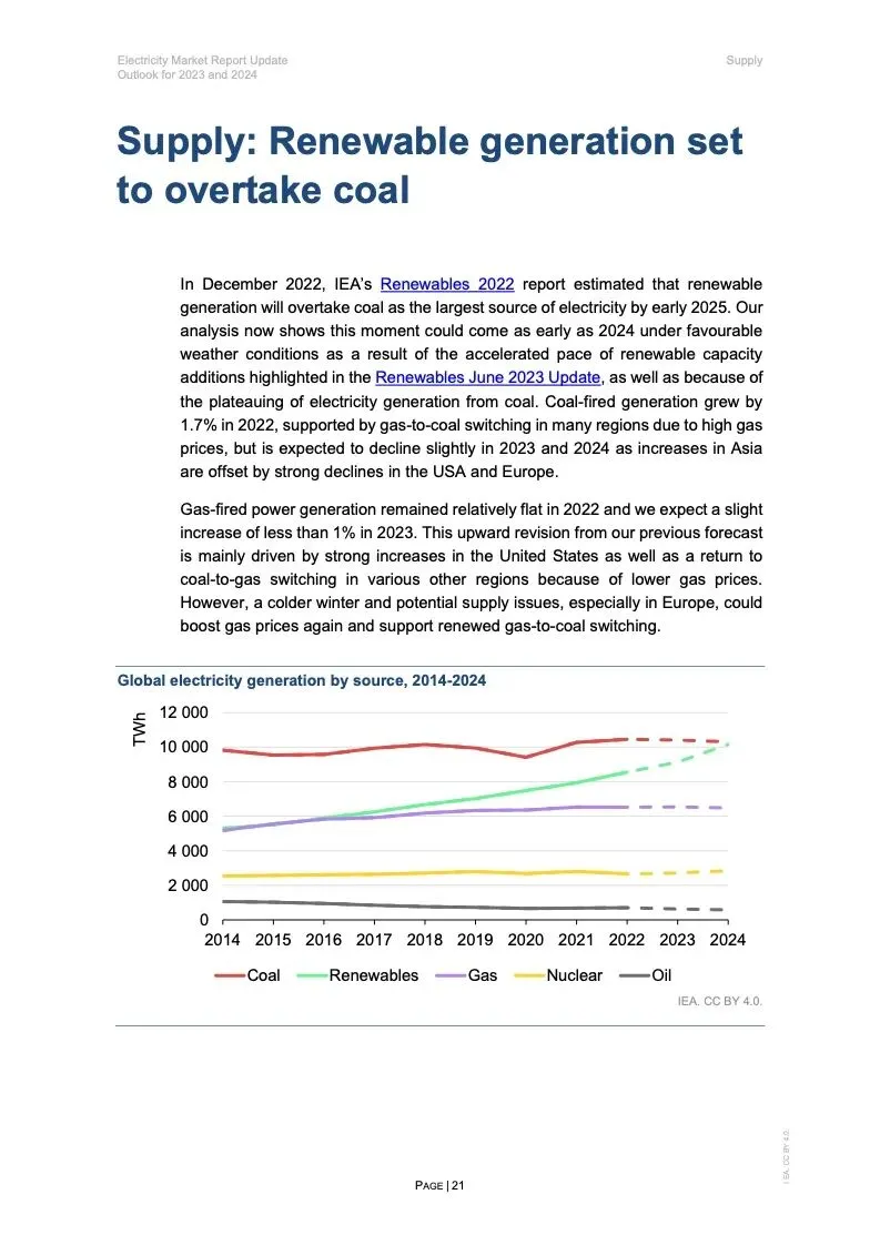 近年来,全球电力需求有所增加,但化石燃料的发电量却出现了下降。《报告》指出,2022年化石能源发电量增长缓慢(1%),且预计2023、2024年将分别下降0.6%和1.2%。其中,石油发电量将出现大幅下降,燃煤发电量虽在2022年增长了1.5%,但预计未来两年也将呈现下降趋势。随着化石燃料发电进入结构性下降趋势,可再生能源将在2023年和2024年满足全球所有电力需求增量。到2024年,可再生能源在全球发电量中的份额将首次超过三分之一,取代煤炭成为世界上最大的发电来源。