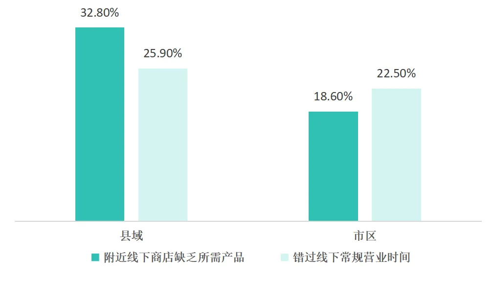 一二线市场竞争日趋激烈,县域市场快速崛起,2023年规模已达1500亿元。核心动因源于县域商业供给不足:32.8%消费者因线下缺货、25.9%因营业时间受限选择即时零售,比例均高于城市。