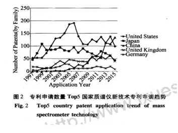 从公司专利申请数量分析,沃特世、岛津、赛默飞、安捷伦、日立公司处于前五位。沃特世和岛津的专利申请数量在经历了2006年的低潮后持续增加,特别是沃特世2011年后专利申请数量迅速增加,质谱仪技术得到了新突破;赛默飞世尔和日立的专利申请数量在2008年达到一个高峰后稍有回落,在2014年又呈现增长的趋势;安捷伦的专利申请数量在2007年达到高峰后急剧下降,虽然在2011年稍有恢复,但总体下降趋势明显,发展遭遇了技术瓶颈。