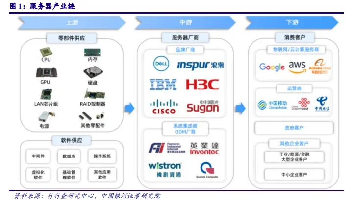服务器产业链上游厂商主要为电子元件厂商及软件提供商,中游为服务器厂商,下游客户则包括数据中心、政府、各类企业等。