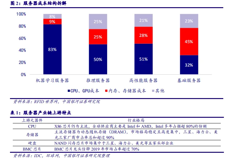 根据 IDC 在2018 年服务器成本结构数据显示,芯片成本在基础型服务器中约占总成本的 32%,而在高性能或更强性能的服务器中,芯片成本占比高达 50%~83%。