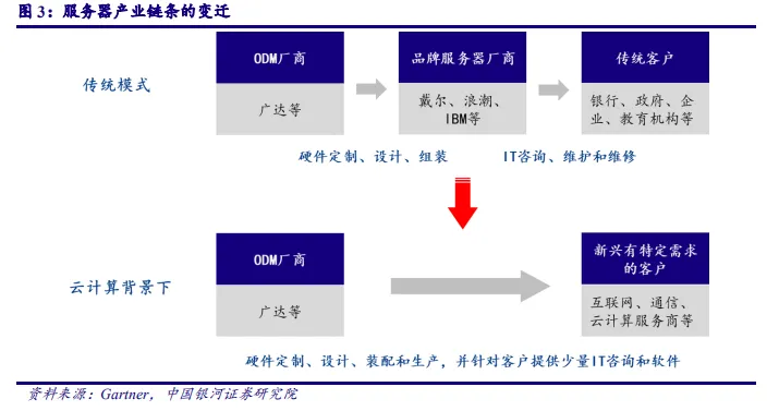 1)白牌服务器厂商,是指以广达为代表的ODM厂商,ODM厂商根据品牌服务器厂商的委托完成硬件生产,加贴委托方商标并交付至品牌持有者进行销售。由于白牌服务厂商凭借其技术优势可承担服务器设计工作,因此,近些年一些有特定需求的客户倾向绕过品牌厂商直接订购服务器成品。