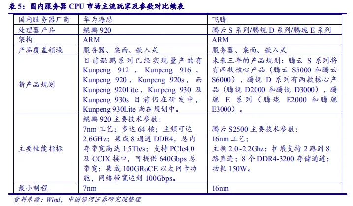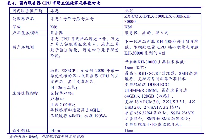 但近几年国产芯片迎头赶上,2020-2021 年信创项目落地,国产服务器在党政机关及部分行业开始应用,国产服务器的可用性得到初步验证。并且随着国产芯片厂商及服务器厂商持续更迭产品,产品性能将不断提升。目前,国内服务器 CPU 市场海光、华为海思占据主要份额,产品已实现大规模商用,未来市场发展空间巨大。