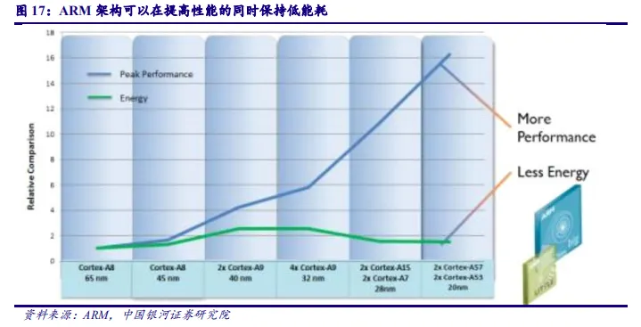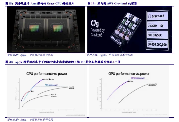 其中,苹果和微软计划发布基于 ARM 的个人电脑,在同等功耗水平下表先出了绝对性的性能优势;今年 3 月英伟达宣布推出首款面向AI 基础设使和高性能计算的基于ARM®Neoverse™的数据中心专属 CPU-Grace CPU 超级芯片,该芯片拥有最高性能的同时,也领先当今服务器芯片内存宽带和能效的两倍;亚马逊 AWS 在 2021 年 12 月宣布全新的AWS Graviton3 处理器,借助 ARM Neoverse 架构,可在特定领域带来极高的能源效率,大幅降低能耗并提升处理速度。