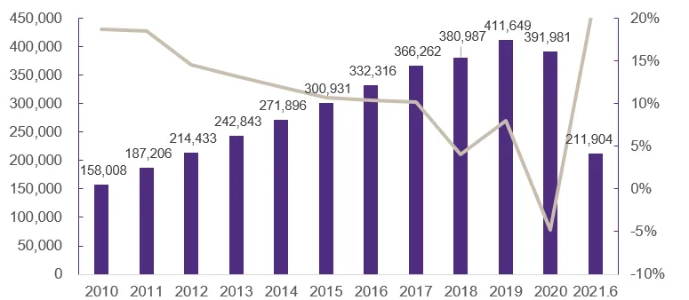 2010-2019年期间,中国消费市场的规模从15.8万亿元人民币增长到41.2万亿人民币,平均每年增长2.8万亿元人民币。2020年,由于疫情影响,中国消费市场的规模不增反降,较预期下降4.8万亿元人民币,跌至39.2万亿元人民币。2021年1至6月,国内社会消费品零售总额回升到21.2亿元人民币,较2020年疫情期间同比增长23.0%,较2019年非疫情期间同比增长8.55%,总体发展趋势向好。