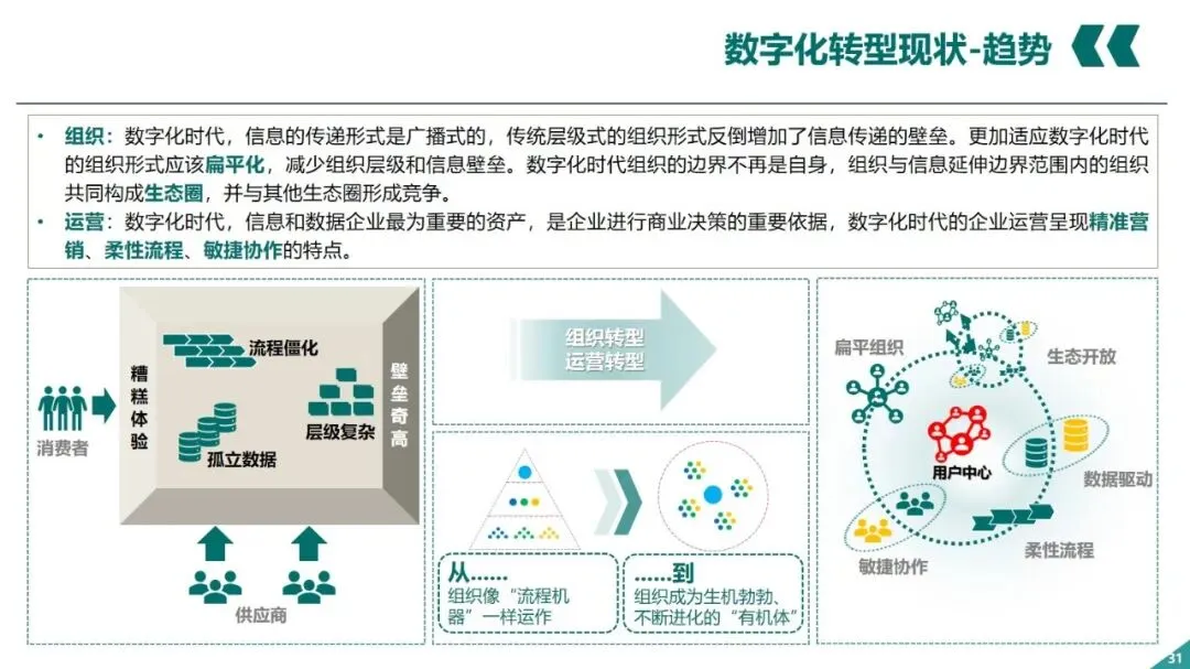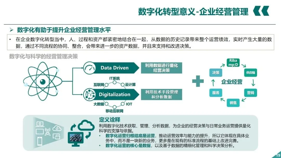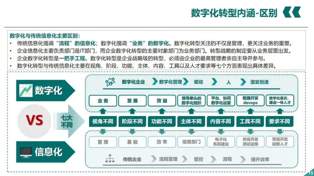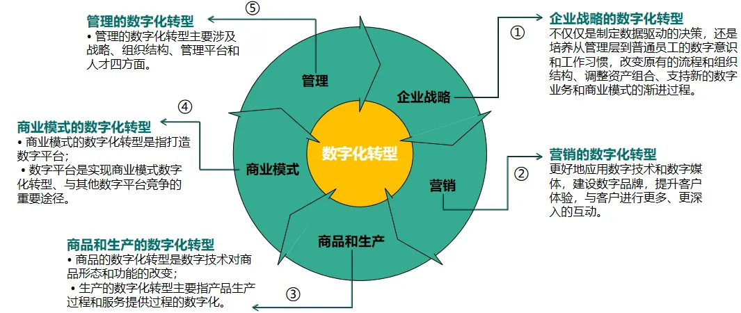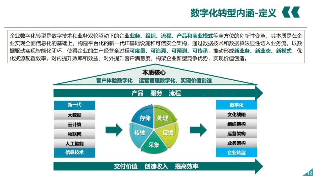数字化转型的核心是靠数据驱动,前提是企业先实现全面信息化和业务数据化。借助大数据、云计算、人工智能这些新技术,打破不同部门、不同层级的数据隔阂,让业务流程可追溯、可预测,进而重塑业务模式、组织架构和产品服务。它和传统信息化不一样,不只是把流程搬到线上,更看重业务的重构,而且需要老板亲自牵头,不是单靠信息部门就能完成的,得全员参与,一步步从初步接触数字化的反应期,走到数据驱动决策的成熟期。