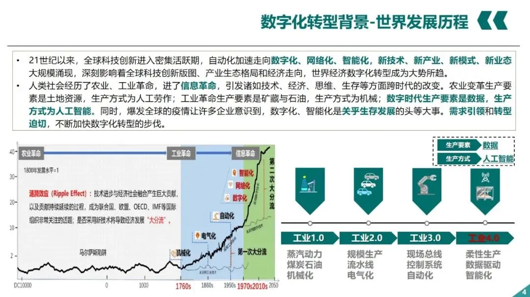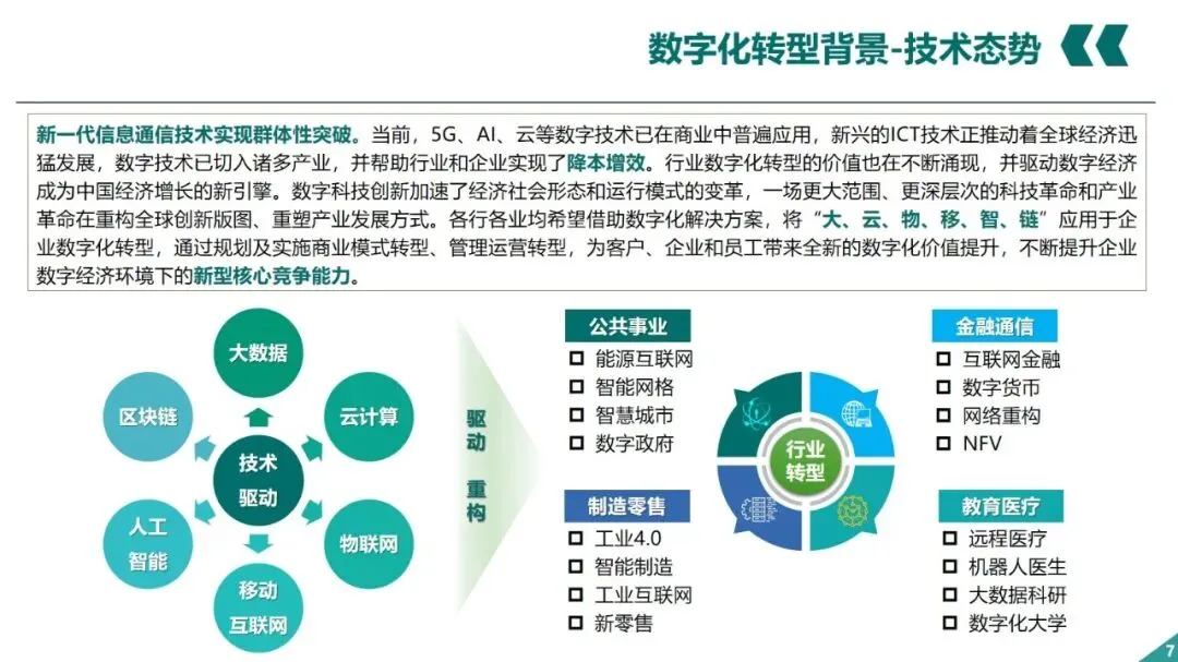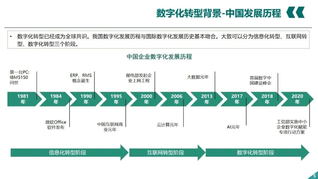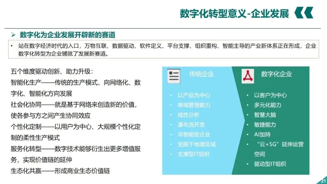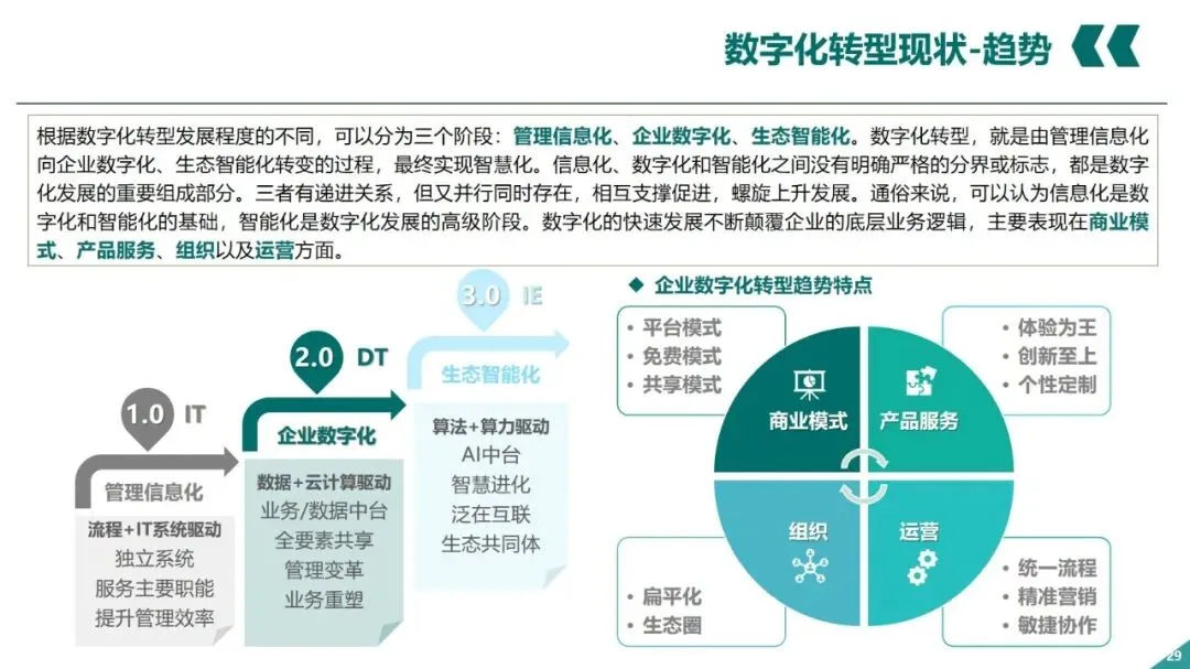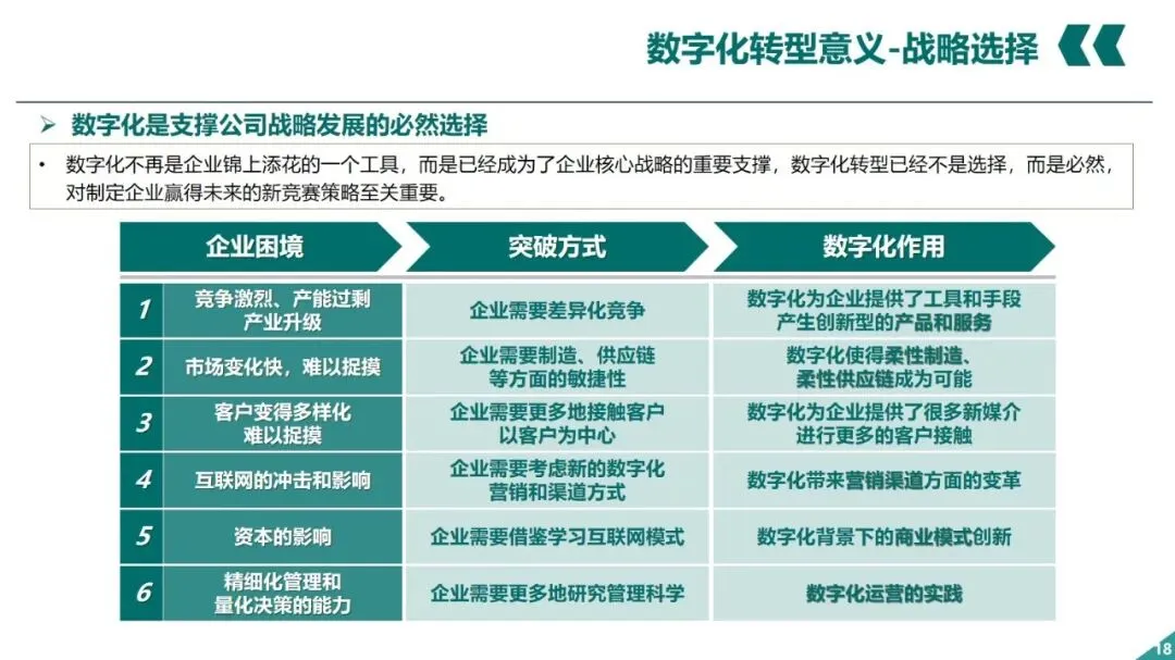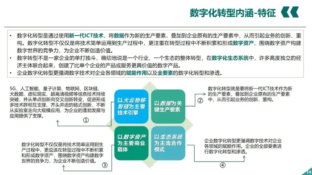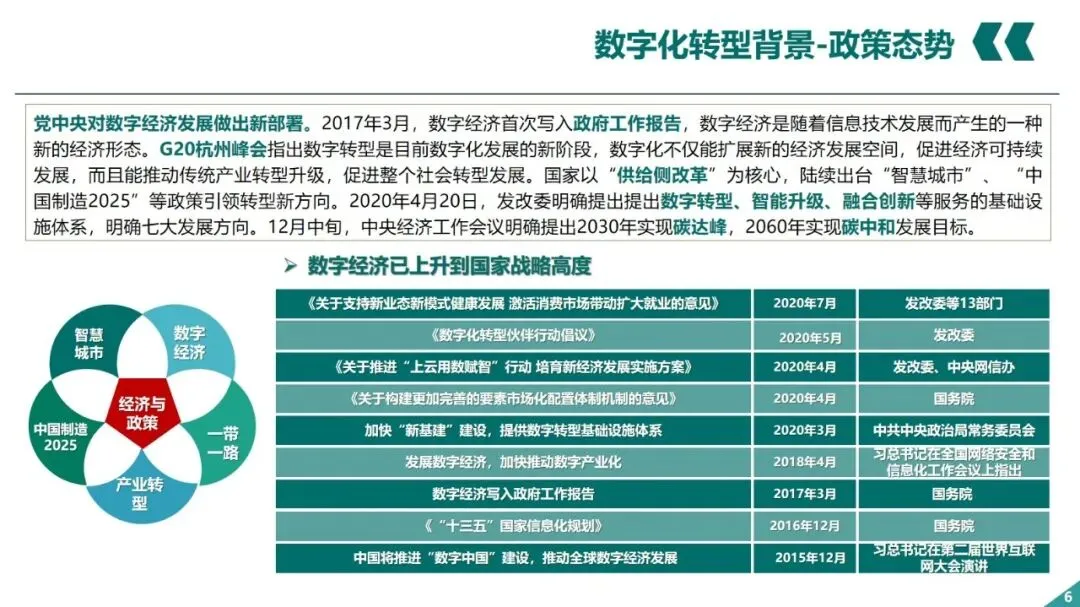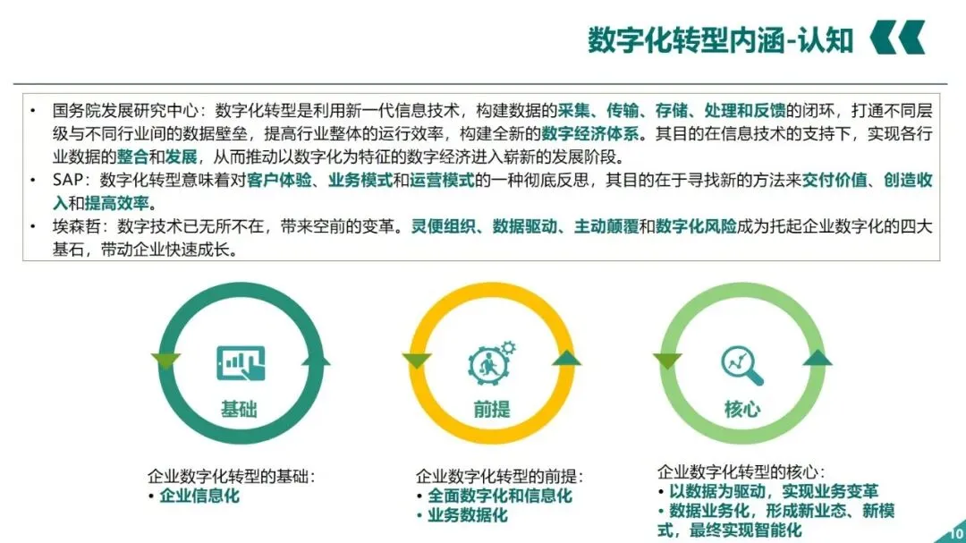 企业数字化转型是数字经济时代绕不开的发展方向,本质是企业借助新一代信息技术,对业务、管理等各方面进行全面创新变革的战略举措。进入 21 世纪,全球科技创新变得活跃,自动化逐步走向数字化、网络化、智能化,新技术、新业态不断涌现。加上全球疫情的影响,很多企业真切感受到,数字化、智能化是活下去、谋发展的关键,而我国从信息化到互联网再到数字化转型的历程,以及 “数字中国”“中国制造 2025” 等系列政策支持,也为企业转型铺好了道路。