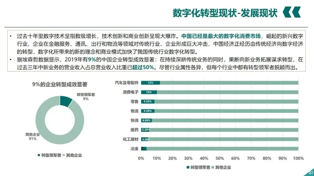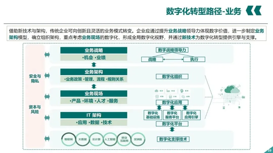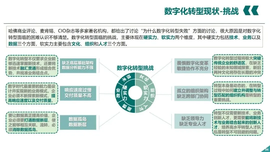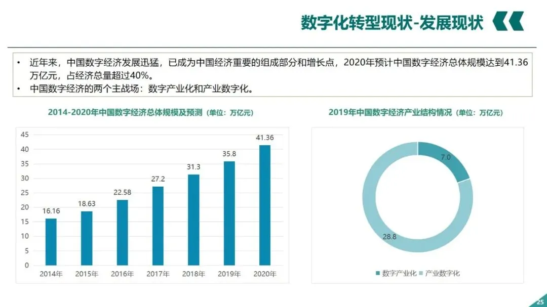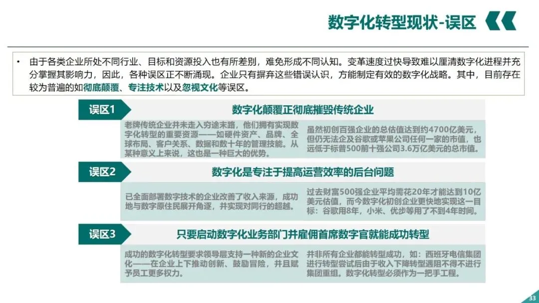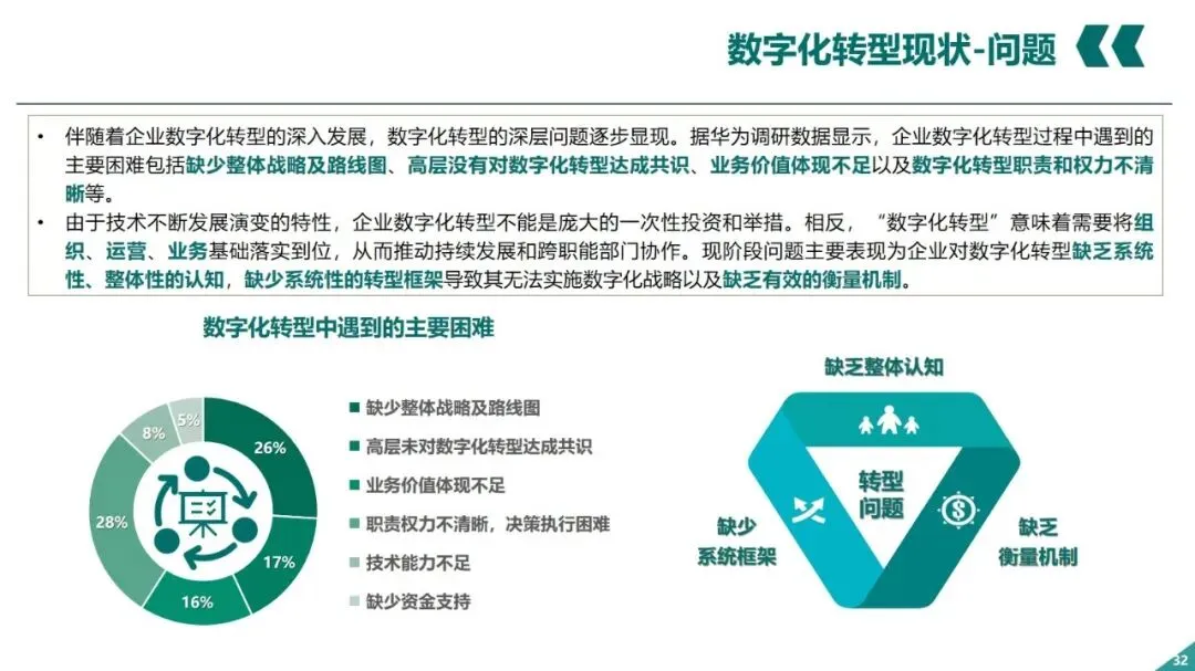现在,我国数字经济规模已经超过 40 万亿元,成为经济增长的重要动力。但不同行业的转型进度差别很大,服务业数字化水平最高,工业次之,农业相对滞后。虽然有少数企业转型效果突出,新业务收入占比超 50%,但更多企业面临没明确战略、转型价值不明显、缺数字化人才等难题,还容易陷入 “只重技术不重业务”“想彻底颠覆传统” 的误区。