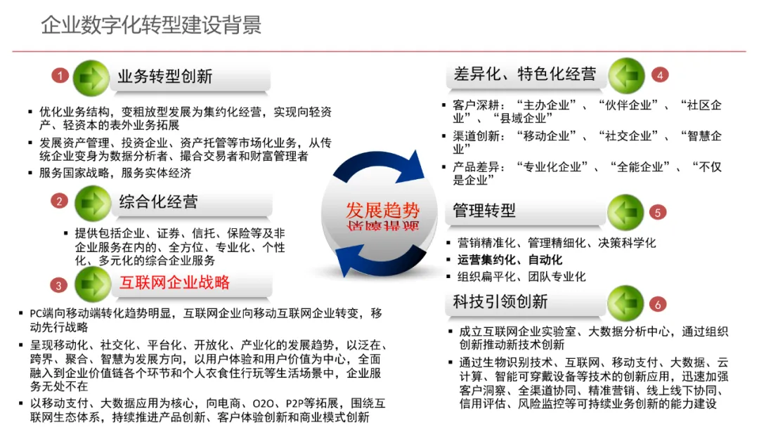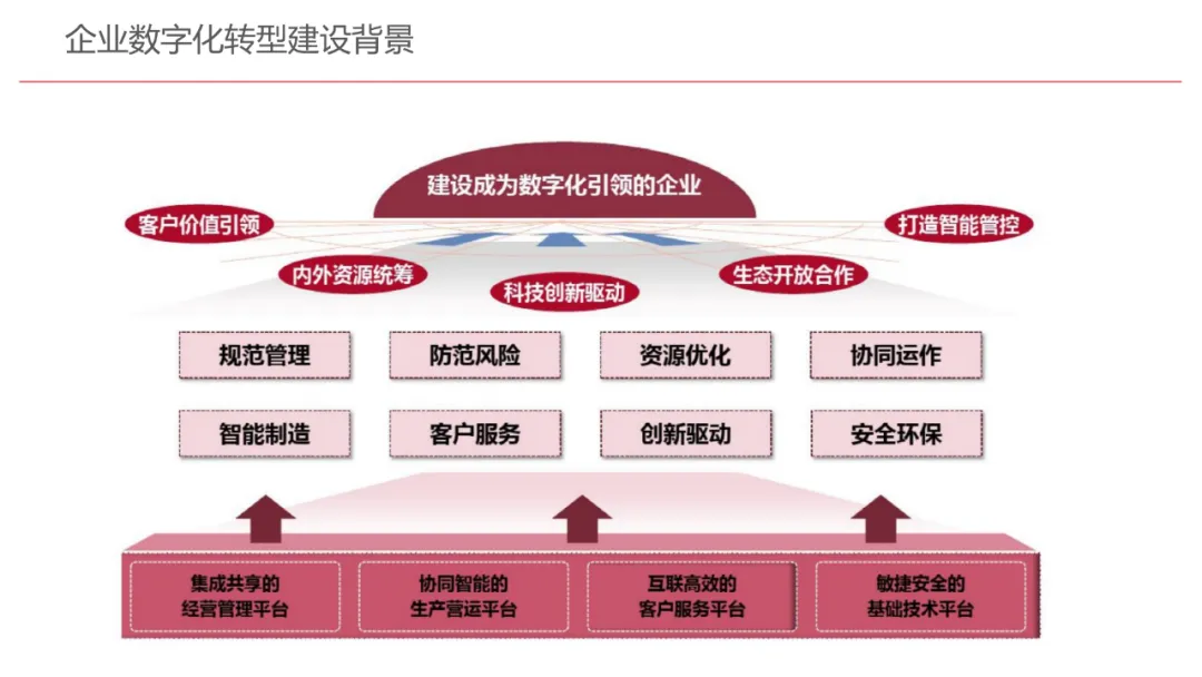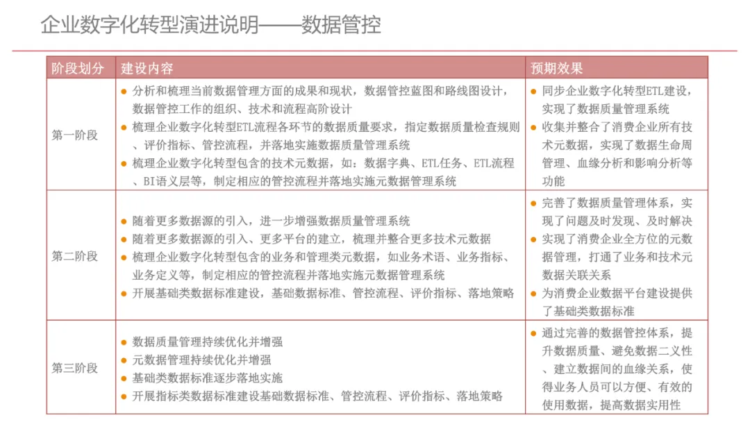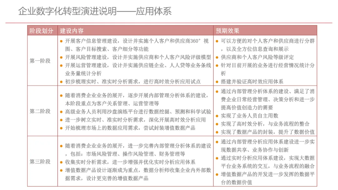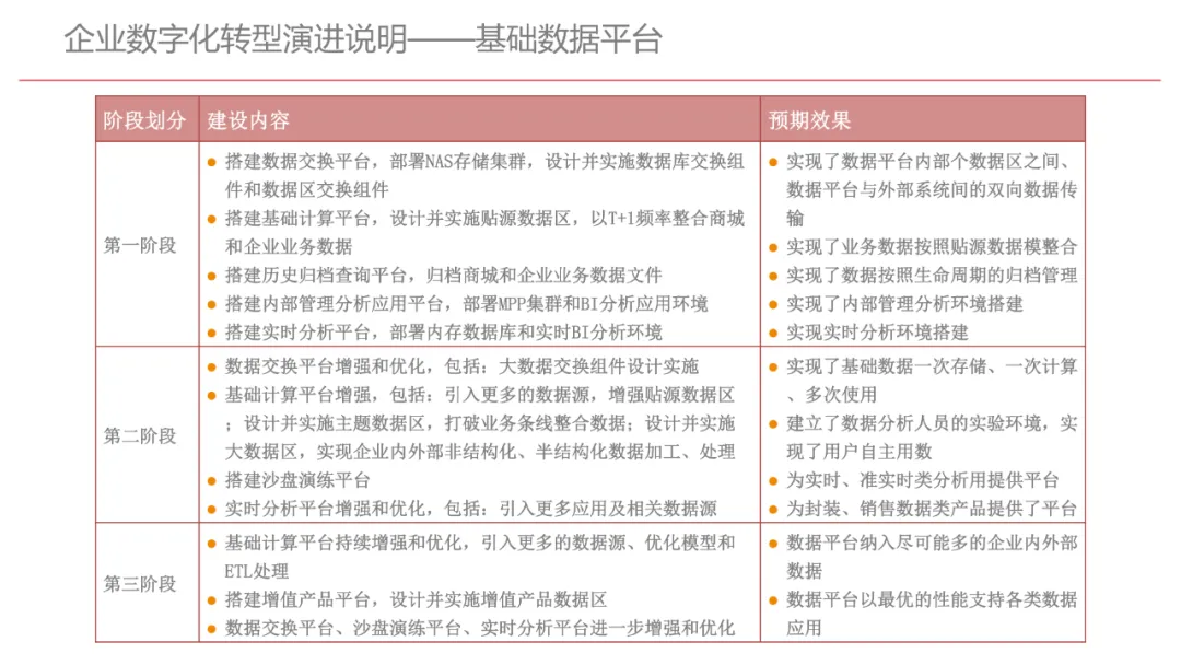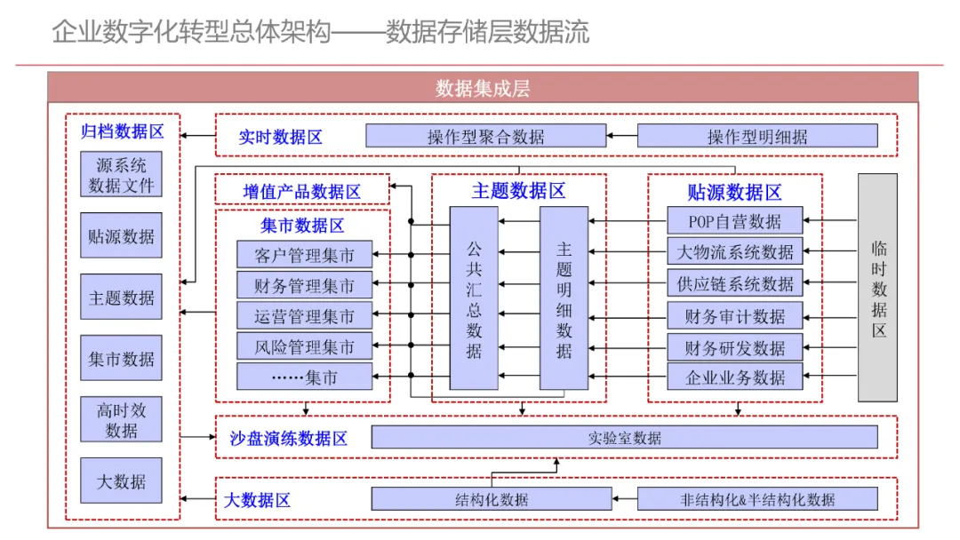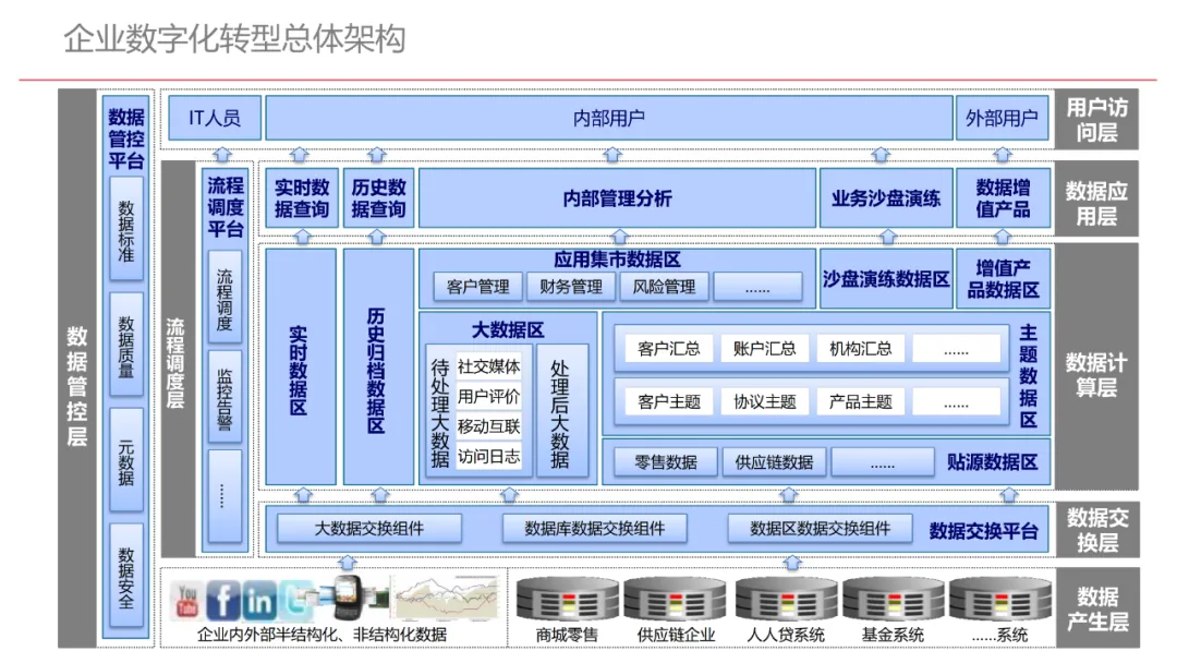 今天想和你分享一份我最近深入研读的《企业数字化转型规划设计》PPT,这份材料虽然结构上略显复杂,但内容非常扎实,涵盖了从建设背景、需求分析、顶层设计到业务应用和未来展望的完整框架,可以说是企业数字化转型的“百科全书级”蓝图。一、内容框架梳理建设背景:从移动化、社交化、平台化趋势切入,强调数据驱动和用户体验,尤其分析了P2P、O2O等新兴业务模式与企业数字化的结合点。需求分析:提出了以数据为核心的企业级架构,涵盖数据产生、交换、存储、应用、管控五个层面,形成了完整的数据治理体系。顶层设计:给出了企业数字化转型的演进路线图,分阶段推进,强调“基础先行、管控同步、应用驱动”。业务应用:详细阐述了数据交换平台、流程调度、基础计算平台等核心系统的架构设计与实施责任划分。未来展望:重点提出了数据质量管理平台的技术架构,强调数据质量是数字化转型的“生命线”。二、值得借鉴的四个方法论1. 数据分层治理,避免“一锅粥”材料中提出了贴源数据区、主题数据区、集市数据区等多层数据存储结构。这种分层不是技术上的炫技,而是治理上的必然。很多企业在做数据中台时喜欢“大集中”,反而导致数据混乱、难以维护。分层治理的本质是职责分离:贴源存原始,主题做整合,集市供应用。建议你在设计数据架构时,明确每一层的数据责任人、更新机制和访问权限,避免出现“谁都能动,谁都不负责”的局面。2. 流程调度是“隐形引擎”PPT中用了不少篇幅讲流程调度平台(TaskAutomation),这可能容易被忽视,但其实是数字化转型的“中枢神经”。无论是批量处理、实时流处理还是归档流程,都需要一个统一的调度引擎来确保任务有序、可控、可监控。如果你的企业还在用脚本+crontab的方式跑任务,建议尽早规划统一的流程调度平台。这不仅提升效率,更是系统稳定性的保障。3. 数据管控不是IT的事,是组织的事材料中明确提出了“数据管控组织”的概念,并划分了数据所有人、认责人、使用人等角色。这一点非常关键:数据治理的难点从来不在技术,而在组织与权责。没有明确的组织保障和考核机制,再好的数据平台也难以持续。建议你在推动数据治理时,先推动成立“数据治理委员会”,明确业务部门的数据责任,把数据质量纳入KPI。4. 分阶段演进,拒绝“大跃进”PPT将数字化转型分为三个阶段:基础搭建、应用扩展、深化智能。每个阶段都有明确的目标和输出,这种“小步快跑、迭代推进”的思路非常务实。很多企业喜欢一上来就搞“AI大数据”,结果基础不牢,中途夭折。建议你为企业制定一个3—5年的数字化路线图,每年聚焦1—2个核心场景,打出标杆后再复制推广。三、几个容易被忽略的“细节智慧”“增量为主,全量为辅”的数据接入策略:减轻源系统压力,提升同步效率。沙盘演练数据区:为数据科学家和业务试错提供“安全沙箱”,鼓励创新而不影响生产。归档策略与生命周期管理:不是所有数据都需要永远在线,合理的归档是成本与效率的平衡。四、写在最后数字化转型不是买一套系统、建一个平台那么简单。它是一场涉及战略、组织、流程、技术的系统性工程。这份PPT虽然技术细节较多,但其背后体现的架构思维、治理意识和演进逻辑,值得我们每一个数字化从业者反复品味。如果你正在为企业设计数字化转型蓝图,不妨以这份材料为参考,结合自身业务特点,走出一条有阶段、有管控、有场景的务实之路。概述了企业数字化转型的背景和发展趋势。内容强调了业务转型创新、综合化经营、互联网企业战略、差异化和特色化经营、管理转型以及科技引领创新六个关键领域。专家解读认为,企业数字化转型是适应市场变化、提升竞争力的必经之路。通过优化业务结构、发展资产管理、服务国家战略、提供综合企业服务、深化客户和渠道创新、实现产品差异化、推动管理精细化和科技化,企业能够更好地适应数字化时代的需求,实现可持续发展。概述了企业数字化转型的建设背景,展示了从1970年代到2030年代的技术发展浪潮及其核心驱动技术和新的商业模式。内容涵盖从主机时代的文件系统和批处理,到个人电脑和互联网1.0的B2B、B2C和ERP,再到数字化时代的社交网络、大数据和云计算,以及认知时代的人工智能和机器学习。专家解读认为,这一发展历程反映了技术如何不断推动企业运营模式的变革,从自动化数据处理到知识型工作和企业重构,再到数字化业务和智能化决策,企业必须不断适应技术进步以保持竞争力。展示了企业数字化转型的建设背景,对比了IT时代与互联化时代企业运作模式的差异。IT时代以计算机和软件为核心,系统孤立、模式单一;而互联化时代则强调云服务、数据服务、服务化、自动化和组件化,支持一切皆服务(XaaS)、万物互联和敏捷开发。专家解读认为,这种转变反映了企业从封闭、独立的系统向开放、互联的生态系统演进的趋势,数字化转型不仅是技术升级,更是业务模式和运营理念的全面革新,企业需积极拥抱互联互通、资源共享和成本节约等互联化特征,以适应数字化时代的新要求。探讨了企业数字化转型的建设背景,强调了社交和移动化趋势、媒体、分析工具和云计算等技术如何根本性地改变消费者购买和使用产品及服务的方式。专家解读指出,未来十年,四