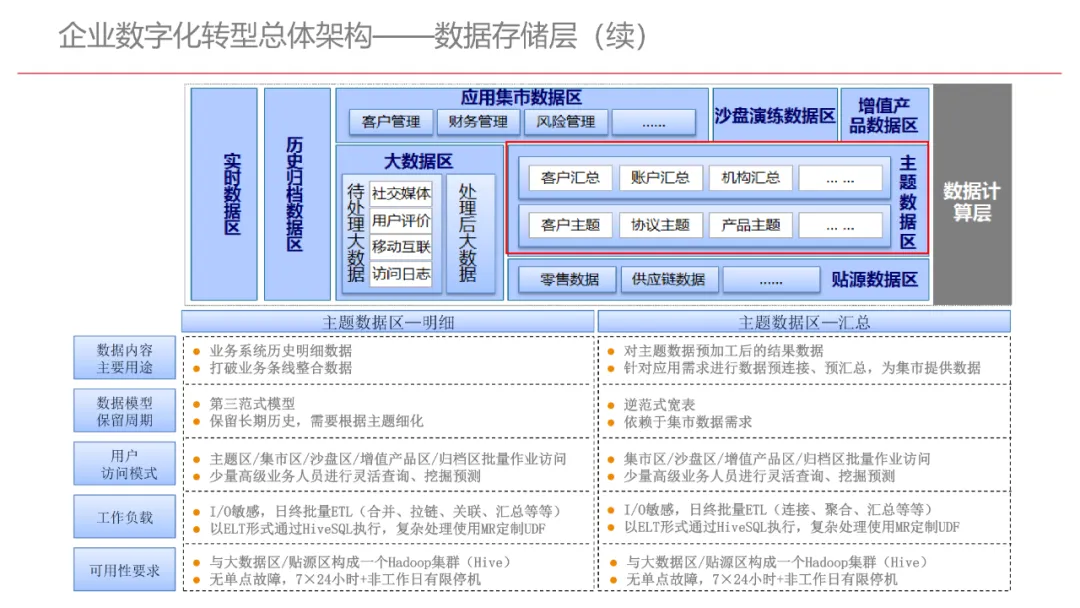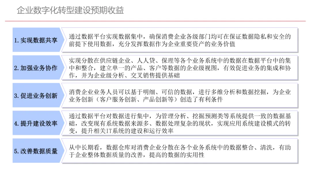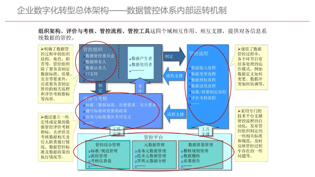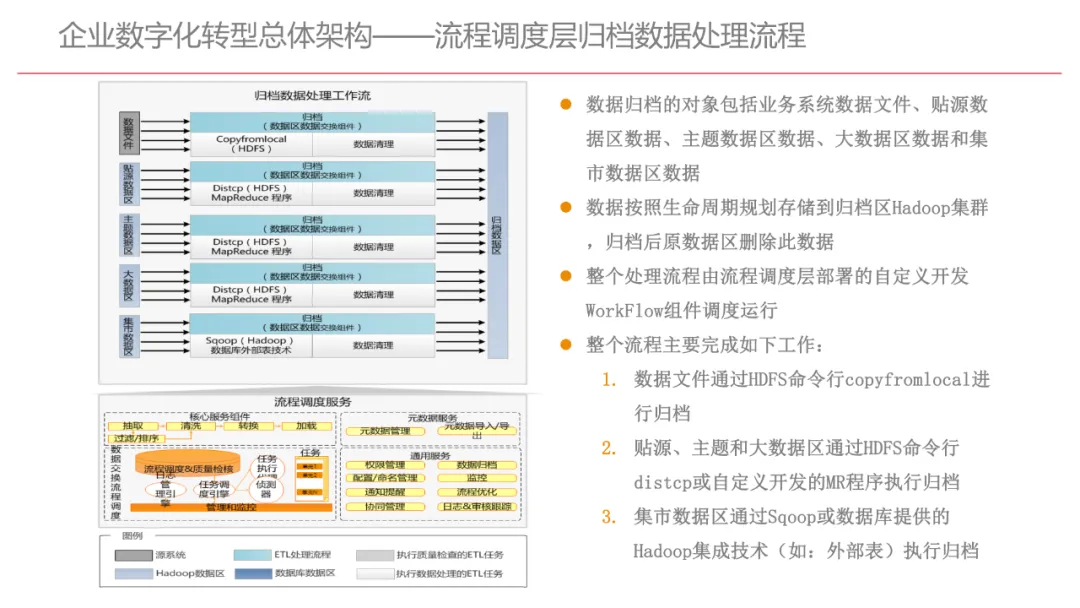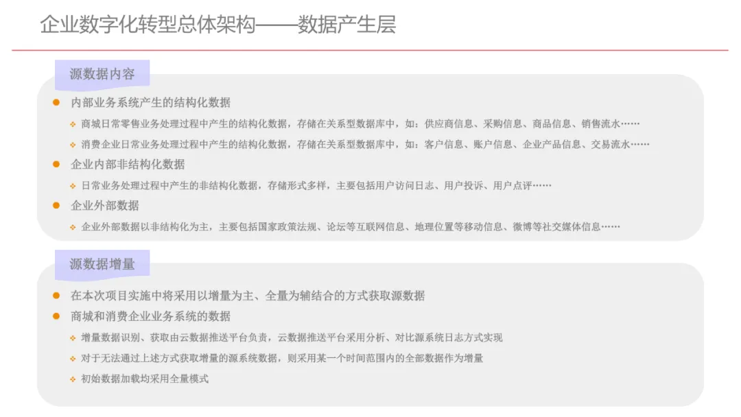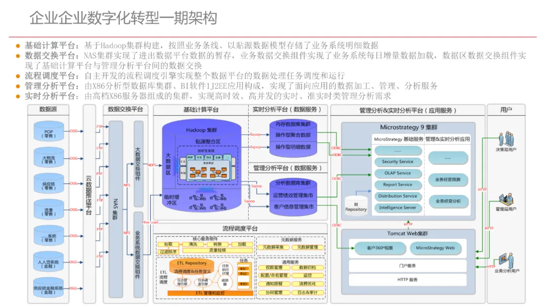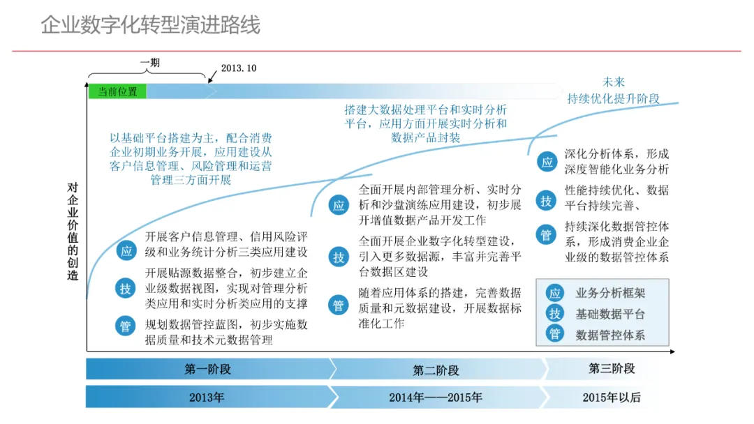 今天想和你分享一份我最近深入研读的《企业数字化转型规划设计》PPT,这份材料虽然结构上略显复杂,但内容非常扎实,涵盖了从建设背景、需求分析、顶层设计到业务应用和未来展望的完整框架,可以说是企业数字化转型的“百科全书级”蓝图。一、内容框架梳理建设背景:从移动化、社交化、平台化趋势切入,强调数据驱动和用户体验,尤其分析了P2P、O2O等新兴业务模式与企业数字化的结合点。需求分析:提出了以数据为核心的企业级架构,涵盖数据产生、交换、存储、应用、管控五个层面,形成了完整的数据治理体系。顶层设计:给出了企业数字化转型的演进路线图,分阶段推进,强调“基础先行、管控同步、应用驱动”。业务应用:详细阐述了数据交换平台、流程调度、基础计算平台等核心系统的架构设计与实施责任划分。未来展望:重点提出了数据质量管理平台的技术架构,强调数据质量是数字化转型的“生命线”。二、值得借鉴的四个方法论1. 数据分层治理,避免“一锅粥”材料中提出了贴源数据区、主题数据区、集市数据区等多层数据存储结构。这种分层不是技术上的炫技,而是治理上的必然。很多企业在做数据中台时喜欢“大集中”,反而导致数据混乱、难以维护。分层治理的本质是职责分离:贴源存原始,主题做整合,集市供应用。建议你在设计数据架构时,明确每一层的数据责任人、更新机制和访问权限,避免出现“谁都能动,谁都不负责”的局面。2. 流程调度是“隐形引擎”PPT中用了不少篇幅讲流程调度平台(TaskAutomation),这可能容易被忽视,但其实是数字化转型的“中枢神经”。无论是批量处理、实时流处理还是归档流程,都需要一个统一的调度引擎来确保任务有序、可控、可监控。如果你的企业还在用脚本+crontab的方式跑任务,建议尽早规划统一的流程调度平台。这不仅提升效率,更是系统稳定性的保障。3. 数据管控不是IT的事,是组织的事材料中明确提出了“数据管控组织”的概念,并划分了数据所有人、认责人、使用人等角色。这一点非常关键:数据治理的难点从来不在技术,而在组织与权责。没有明确的组织保障和考核机制,再好的数据平台也难以持续。建议你在推动数据治理时,先推动成立“数据治理委员会”,明确业务部门的数据责任,把数据质量纳入KPI。4. 分阶段演进,拒绝“大跃进”PPT将数字化转型分为三个阶段:基础搭建、应用扩展、深化智能。每个阶段都有明确的目标和输出,这种“小步快跑、迭代推进”的思路非常务实。很多企业喜欢一上来就搞“AI大数据”,结果基础不牢,中途夭折。建议你为企业制定一个3—5年的数字化路线图,每年聚焦1—2个核心场景,打出标杆后再复制推广。三、几个容易被忽略的“细节智慧”“增量为主,全量为辅”的数据接入策略:减轻源系统压力,提升同步效率。沙盘演练数据区:为数据科学家和业务试错提供“安全沙箱”,鼓励创新而不影响生产。归档策略与生命周期管理:不是所有数据都需要永远在线,合理的归档是成本与效率的平衡。四、写在最后数字化转型不是买一套系统、建一个平台那么简单。它是一场涉及战略、组织、流程、技术的系统性工程。这份PPT虽然技术细节较多,但其背后体现的架构思维、治理意识和演进逻辑,值得我们每一个数字化从业者反复品味。如果你正在为企业设计数字化转型蓝图,不妨以这份材料为参考,结合自身业务特点,走出一条有阶段、有管控、有场景的务实之路。概述了企业数字化转型的背景和发展趋势。内容强调了业务转型创新、综合化经营、互联网企业战略、差异化和特色化经营、管理转型以及科技引领创新六个关键领域。专家解读认为,企业数字化转型是适应市场变化、提升竞争力的必经之路。通过优化业务结构、发展资产管理、服务国家战略、提供综合企业服务、深化客户和渠道创新、实现产品差异化、推动管理精细化和科技化,企业能够更好地适应数字化时代的需求,实现可持续发展。概述了企业数字化转型的建设背景,展示了从1970年代到2030年代的技术发展浪潮及其核心驱动技术和新的商业模式。内容涵盖从主机时代的文件系统和批处理,到个人电脑和互联网1.0的B2B、B2C和ERP,再到数字化时代的社交网络、大数据和云计算,以及认知时代的人工智能和机器学习。专家解读认为,这一发展历程反映了技术如何不断推动企业运营模式的变革,从自动化数据处理到知识型工作和企业重构,再到数字化业务和智能化决策,企业必须不断适应技术进步以保持竞争力。展示了企业数字化转型的建设背景,对比了IT时代与互联化时代企业运作模式的差异。IT时代以计算机和软件为核心,系统孤立、模式单一;而互联化时代则强调云服务、数据服务、服务化、自动化和组件化,支持一切皆服务(XaaS)、万物互联和敏捷开发。专家解读认为,这种转变反映了企业从封闭、独立的系统向开放、互联的生态系统演进的趋势,数字化转型不仅是技术升级,更是业务模式和运营理念的全面革新,企业需积极拥抱互联互通、资源共享和成本节约等互联化特征,以适应数字化时代的新要求。探讨了企业数字化转型的建设背景,强调了社交和移动化趋势、媒体、分析工具和云计算等技术如何根本性地改变消费者购买和使用产品及服务的方式。专家解读指出,未来十年,四