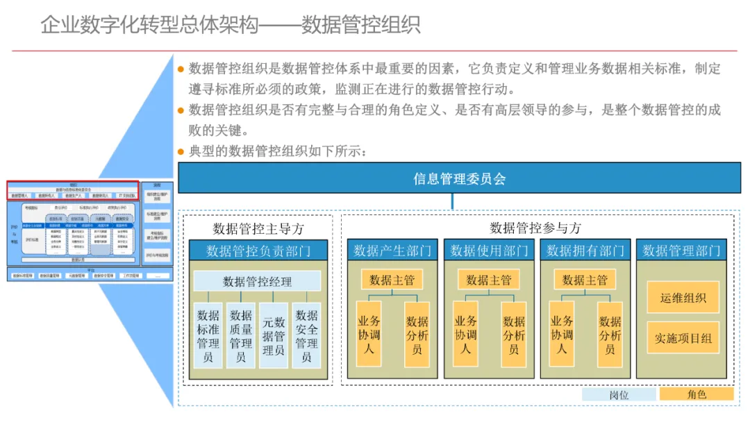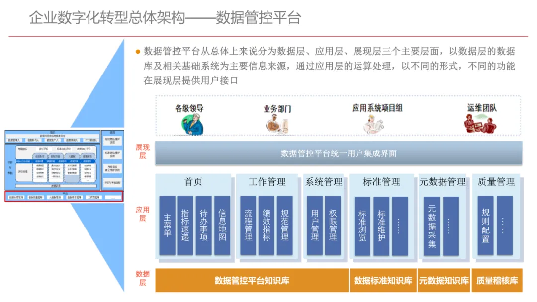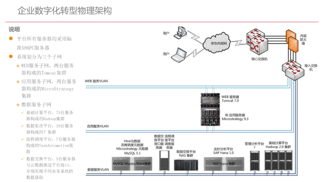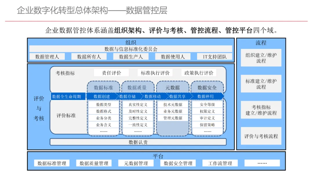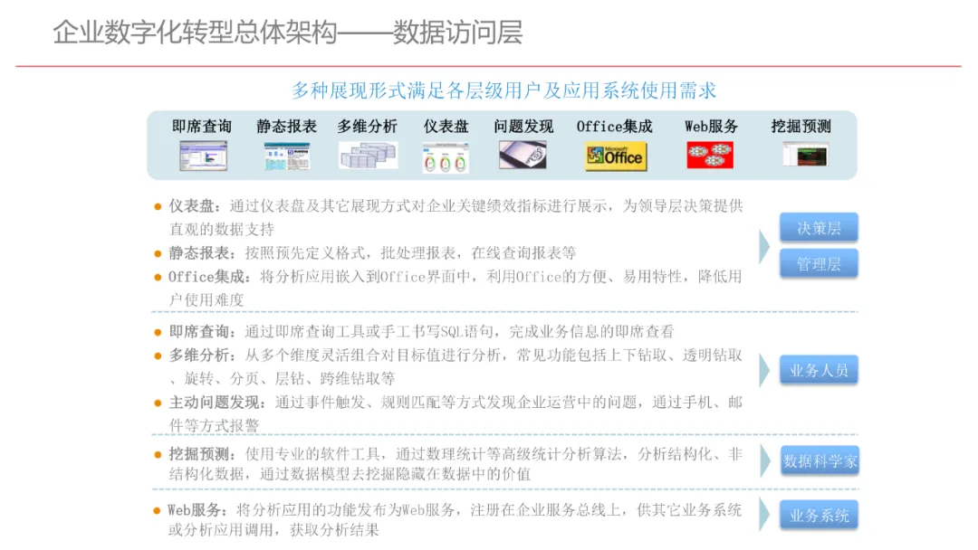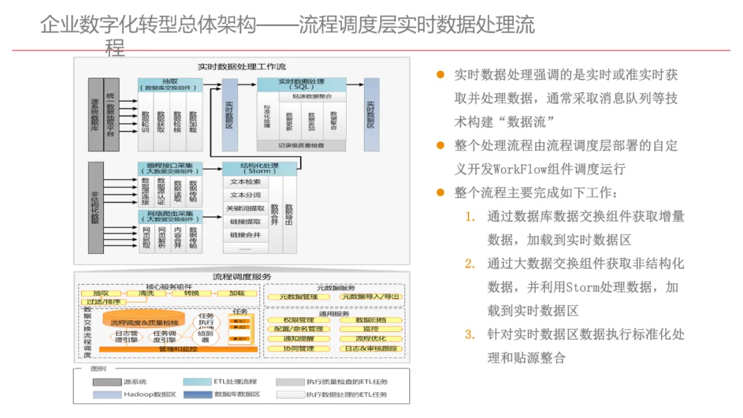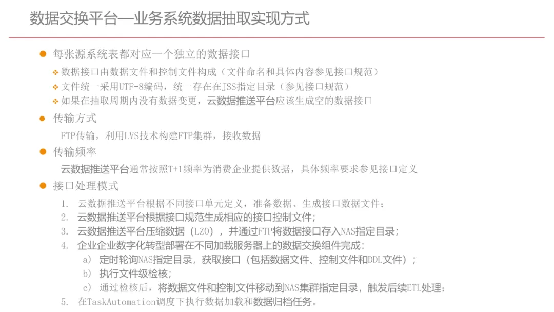 今天想和你分享一份我最近深入研读的《企业数字化转型规划设计》PPT,这份材料虽然结构上略显复杂,但内容非常扎实,涵盖了从建设背景、需求分析、顶层设计到业务应用和未来展望的完整框架,可以说是企业数字化转型的“百科全书级”蓝图。一、内容框架梳理建设背景:从移动化、社交化、平台化趋势切入,强调数据驱动和用户体验,尤其分析了P2P、O2O等新兴业务模式与企业数字化的结合点。需求分析:提出了以数据为核心的企业级架构,涵盖数据产生、交换、存储、应用、管控五个层面,形成了完整的数据治理体系。顶层设计:给出了企业数字化转型的演进路线图,分阶段推进,强调“基础先行、管控同步、应用驱动”。业务应用:详细阐述了数据交换平台、流程调度、基础计算平台等核心系统的架构设计与实施责任划分。未来展望:重点提出了数据质量管理平台的技术架构,强调数据质量是数字化转型的“生命线”。二、值得借鉴的四个方法论1. 数据分层治理,避免“一锅粥”材料中提出了贴源数据区、主题数据区、集市数据区等多层数据存储结构。这种分层不是技术上的炫技,而是治理上的必然。很多企业在做数据中台时喜欢“大集中”,反而导致数据混乱、难以维护。分层治理的本质是职责分离:贴源存原始,主题做整合,集市供应用。建议你在设计数据架构时,明确每一层的数据责任人、更新机制和访问权限,避免出现“谁都能动,谁都不负责”的局面。2. 流程调度是“隐形引擎”PPT中用了不少篇幅讲流程调度平台(TaskAutomation),这可能容易被忽视,但其实是数字化转型的“中枢神经”。无论是批量处理、实时流处理还是归档流程,都需要一个统一的调度引擎来确保任务有序、可控、可监控。如果你的企业还在用脚本+crontab的方式跑任务,建议尽早规划统一的流程调度平台。这不仅提升效率,更是系统稳定性的保障。3. 数据管控不是IT的事,是组织的事材料中明确提出了“数据管控组织”的概念,并划分了数据所有人、认责人、使用人等角色。这一点非常关键:数据治理的难点从来不在技术,而在组织与权责。没有明确的组织保障和考核机制,再好的数据平台也难以持续。建议你在推动数据治理时,先推动成立“数据治理委员会”,明确业务部门的数据责任,把数据质量纳入KPI。4. 分阶段演进,拒绝“大跃进”PPT将数字化转型分为三个阶段:基础搭建、应用扩展、深化智能。每个阶段都有明确的目标和输出,这种“小步快跑、迭代推进”的思路非常务实。很多企业喜欢一上来就搞“AI大数据”,结果基础不牢,中途夭折。建议你为企业制定一个3—5年的数字化路线图,每年聚焦1—2个核心场景,打出标杆后再复制推广。三、几个容易被忽略的“细节智慧”“增量为主,全量为辅”的数据接入策略:减轻源系统压力,提升同步效率。沙盘演练数据区:为数据科学家和业务试错提供“安全沙箱”,鼓励创新而不影响生产。归档策略与生命周期管理:不是所有数据都需要永远在线,合理的归档是成本与效率的平衡。四、写在最后数字化转型不是买一套系统、建一个平台那么简单。它是一场涉及战略、组织、流程、技术的系统性工程。这份PPT虽然技术细节较多,但其背后体现的架构思维、治理意识和演进逻辑,值得我们每一个数字化从业者反复品味。如果你正在为企业设计数字化转型蓝图,不妨以这份材料为参考,结合自身业务特点,走出一条有阶段、有管控、有场景的务实之路。概述了企业数字化转型的背景和发展趋势。内容强调了业务转型创新、综合化经营、互联网企业战略、差异化和特色化经营、管理转型以及科技引领创新六个关键领域。专家解读认为,企业数字化转型是适应市场变化、提升竞争力的必经之路。通过优化业务结构、发展资产管理、服务国家战略、提供综合企业服务、深化客户和渠道创新、实现产品差异化、推动管理精细化和科技化,企业能够更好地适应数字化时代的需求,实现可持续发展。概述了企业数字化转型的建设背景,展示了从1970年代到2030年代的技术发展浪潮及其核心驱动技术和新的商业模式。内容涵盖从主机时代的文件系统和批处理,到个人电脑和互联网1.0的B2B、B2C和ERP,再到数字化时代的社交网络、大数据和云计算,以及认知时代的人工智能和机器学习。专家解读认为,这一发展历程反映了技术如何不断推动企业运营模式的变革,从自动化数据处理到知识型工作和企业重构,再到数字化业务和智能化决策,企业必须不断适应技术进步以保持竞争力。展示了企业数字化转型的建设背景,对比了IT时代与互联化时代企业运作模式的差异。IT时代以计算机和软件为核心,系统孤立、模式单一;而互联化时代则强调云服务、数据服务、服务化、自动化和组件化,支持一切皆服务(XaaS)、万物互联和敏捷开发。专家解读认为,这种转变反映了企业从封闭、独立的系统向开放、互联的生态系统演进的趋势,数字化转型不仅是技术升级,更是业务模式和运营理念的全面革新,企业需积极拥抱互联互通、资源共享和成本节约等互联化特征,以适应数字化时代的新要求。探讨了企业数字化转型的建设背景,强调了社交和移动化趋势、媒体、分析工具和云计算等技术如何根本性地改变消费者购买和使用产品及服务的方式。专家解读指出,未来十年,四