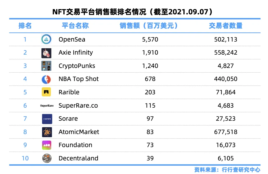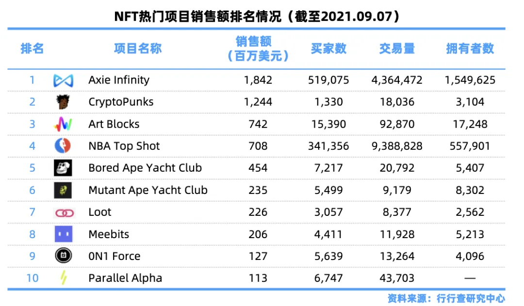 销售额最高的三个NFT项目分别是区块链游戏Axie Infinity、虚拟形象收藏品Cryptopunk、和NBA球员卡收藏品NBA Top Shot,在各大NFT交易平台中的销售额分别达到18.42亿美元、12.44亿美元、7.42亿美元。