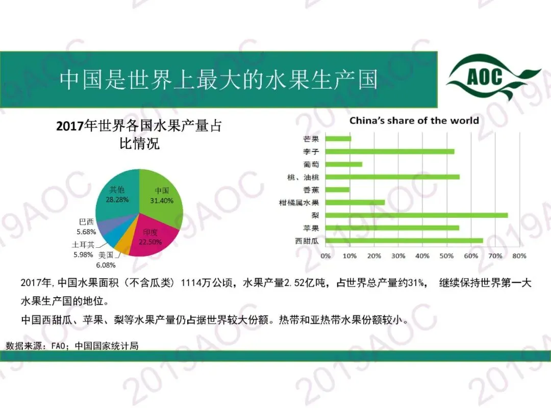 2017年,中国水果面积(不含瓜类)1114万公顷,水果产量2.52亿吨,占世界总产量约31%,继续保持世界第一大水果生产国的地区中国西甜瓜、苹果、梨等水果产量仍占据世界较大份额。热带和亚热带水果份额较小。