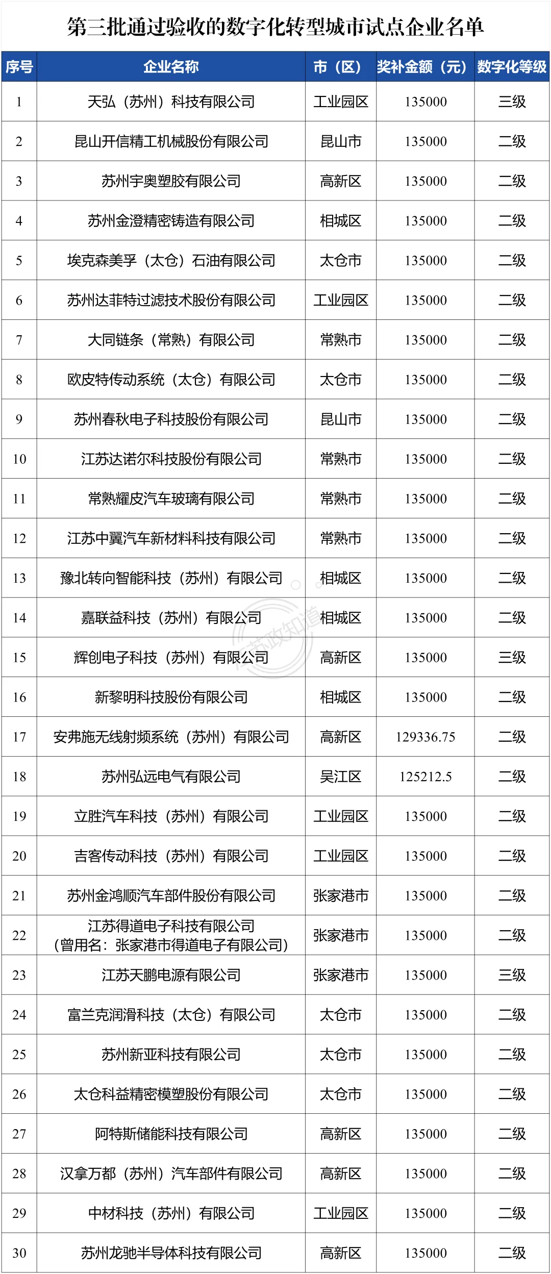 根据《工业和信息化部中小企业局 财政部经济建设司中小企业数字化转型城市试点实施指南》《关于印发〈中小企业数字化转型试点城市试点企业数字化水平评测指南(2024年版)〉的通知》等文件要求,苏州市工业和信息化局对完成数字化改造的试点企业组织审计和验收,核查内容包括数字化改造合同及付款凭证材料的真实性、完整性,企业数字化改造项目实际应用情况、改造后数字化能力提升情况、数字化团队建设情况、数字化水平等级是否达到二级(含)以上,以及相关佐证材料。经第三方审计、现场评测验收、主管部门核查等程序,天弘(苏州)科技有限公司等 283 家试点企业数字化改造合同及付款凭证材料完整,改造内容满足要求,通过验收,现将名单予以公示。