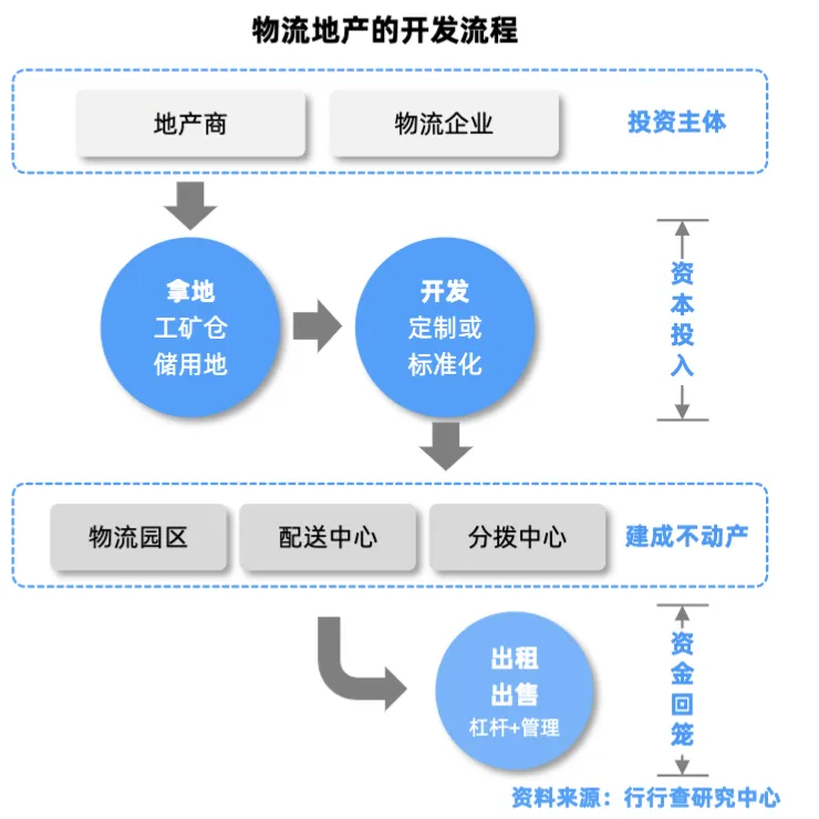 从物流地产项目的运作流程来看,主要包括获取仓储用地、园区规划设计、仓储建设及设施配备、招商出租、仓储运营管理这几个主要环节,而其中开发商拿地、资金获取以及开发运营的能力是物流地产项目能够成功运营的关键所在,是开发商在主导物流地产产业链时实现价值增长的核心能力。
