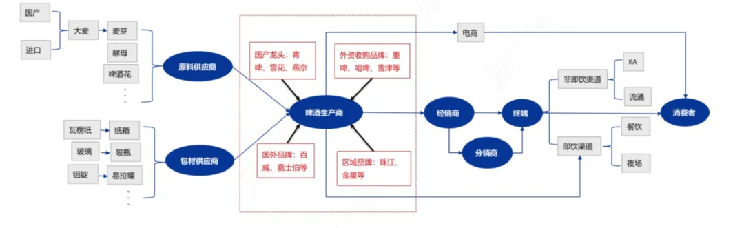 我国啤酒行业涉及产业链上下游较为繁杂,且关系密切。相比白酒等中国传统行业,啤酒属于舶来品,行业参与竞争者多元化,各方参与者的相互竞争与合作推动行业的发展与演变。