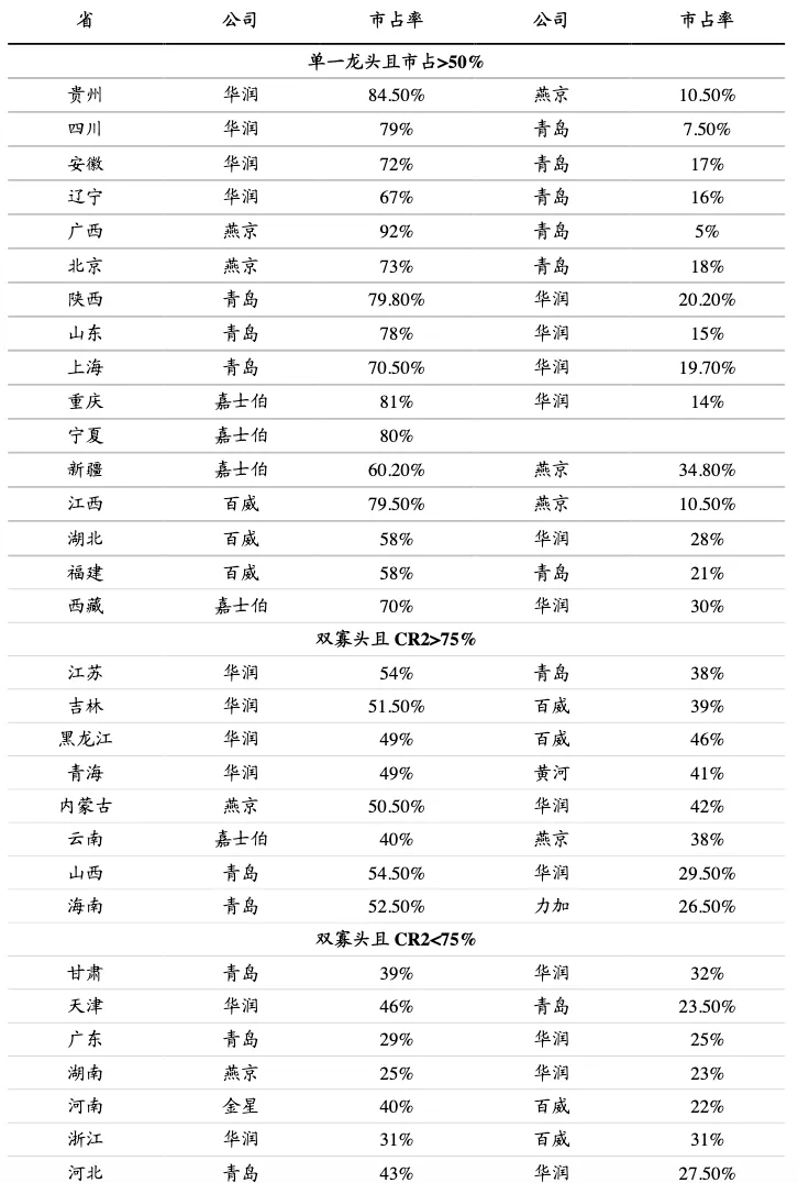 我国啤酒市场呈现群雄割据的局面,区域内部竞争较为充分,各家啤酒公司逐渐从区域走向全国。