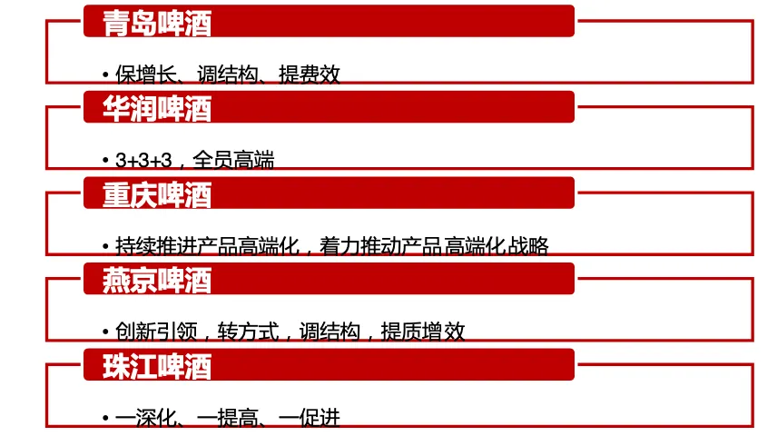 民族厂商如青岛、燕京和珠江坚持自主研发高端产品。华润和重庆啤酒在自研产品的同时,也分别引入喜力和嘉士伯的高端品牌以完善自身产品矩阵。